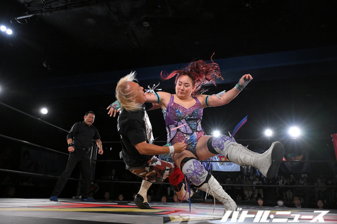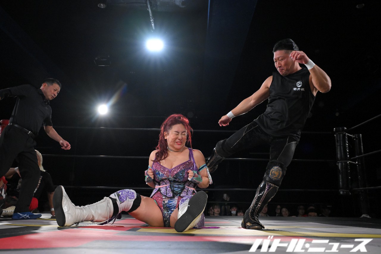 松澤さんと真琴の対面となると、松澤さんは「私はチャンピオンなんだよ!なんで上がってきてんだよ!なんで上がってきてんだよ!私はチャンピオンでぇ!なんで上がってきてんだよ!」という謎理論で真琴に喧嘩を売っていく。真琴が苛立ってヘアホイップを狙うが、松澤さんは振り払って「キエー!キエー!」とモンゴリアン・チョップ連打。そのままロープにくくりつけて顔面を踏みつけようとするが、足の長さが足りない。逆に長い脚を持つ真琴が松澤さんの顔を蹴っ飛ばす。