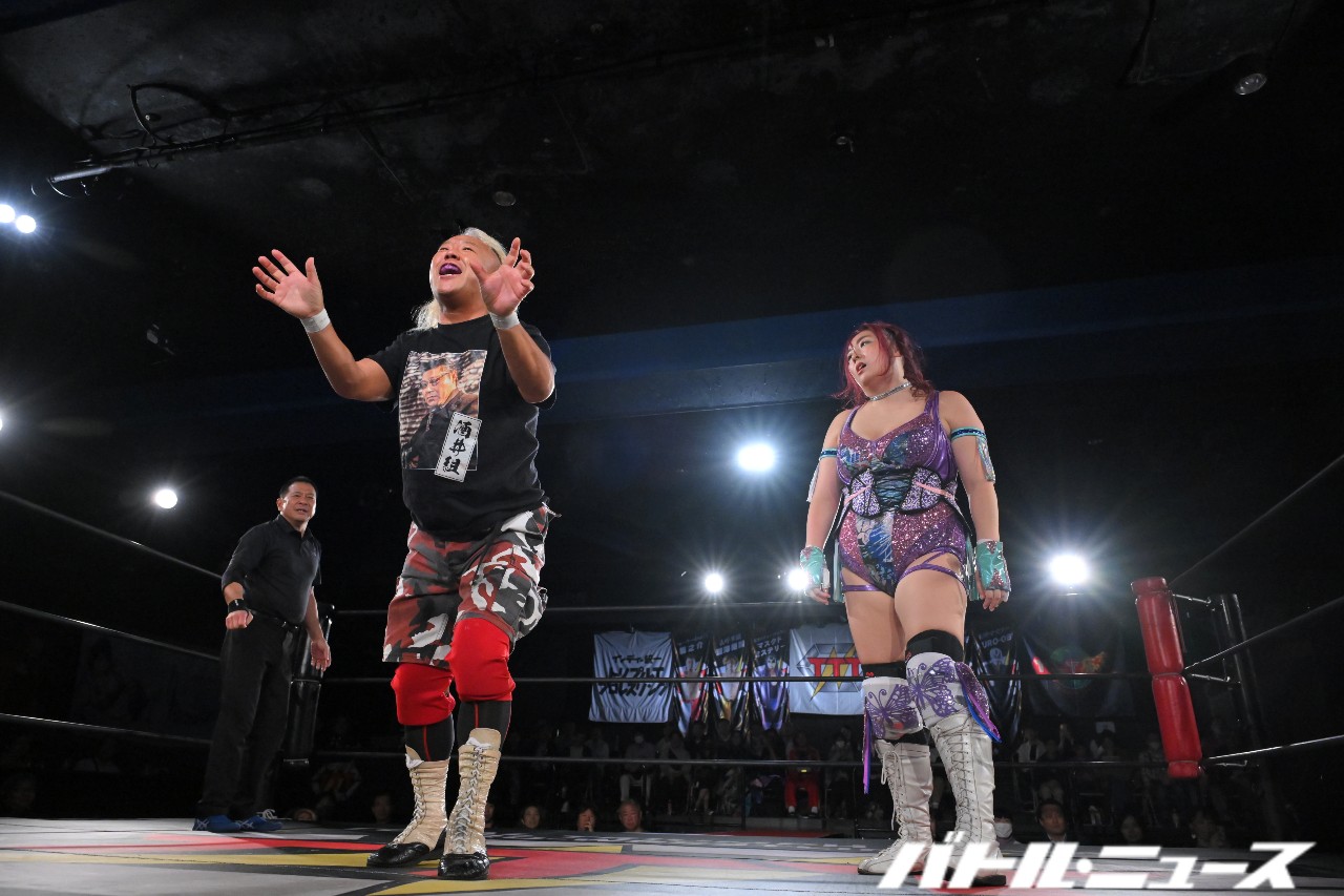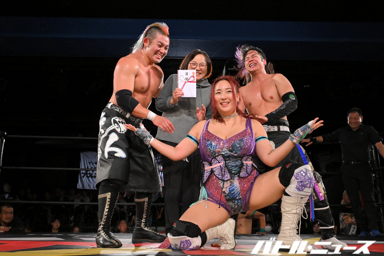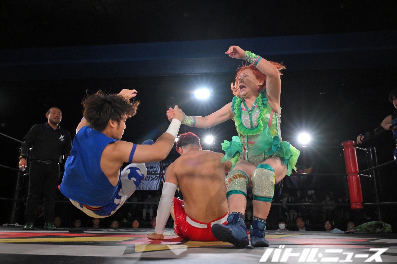 神崎と橋之介がエルボーでゴツゴツと打ち合い、橋之介がローリング・エルボー連打で押していく。神崎は強烈な張り手からロープに飛ぶが、橋之介がカウンターのドロップキック。橋之介がブレーンバスターを狙うと、松澤さんがネギでぶん殴って救出。しかし、すかさず真琴が飛び込んできて神崎へスピアーを見舞い、橋之介がライオンサルトで追撃。ミステリーが神崎をチョークスラムで叩きつけ、橋之介がスワントーン・ボムを決めて3カウントを奪った。