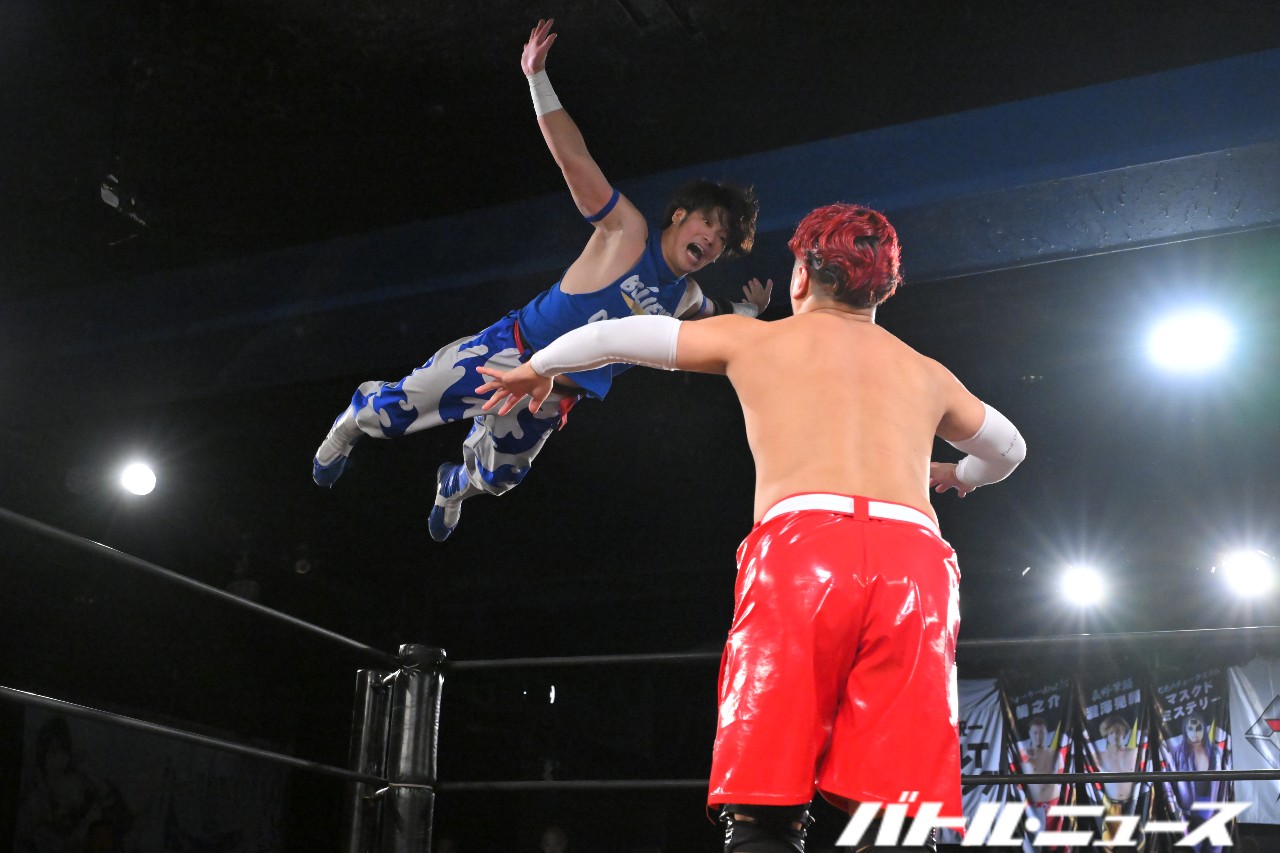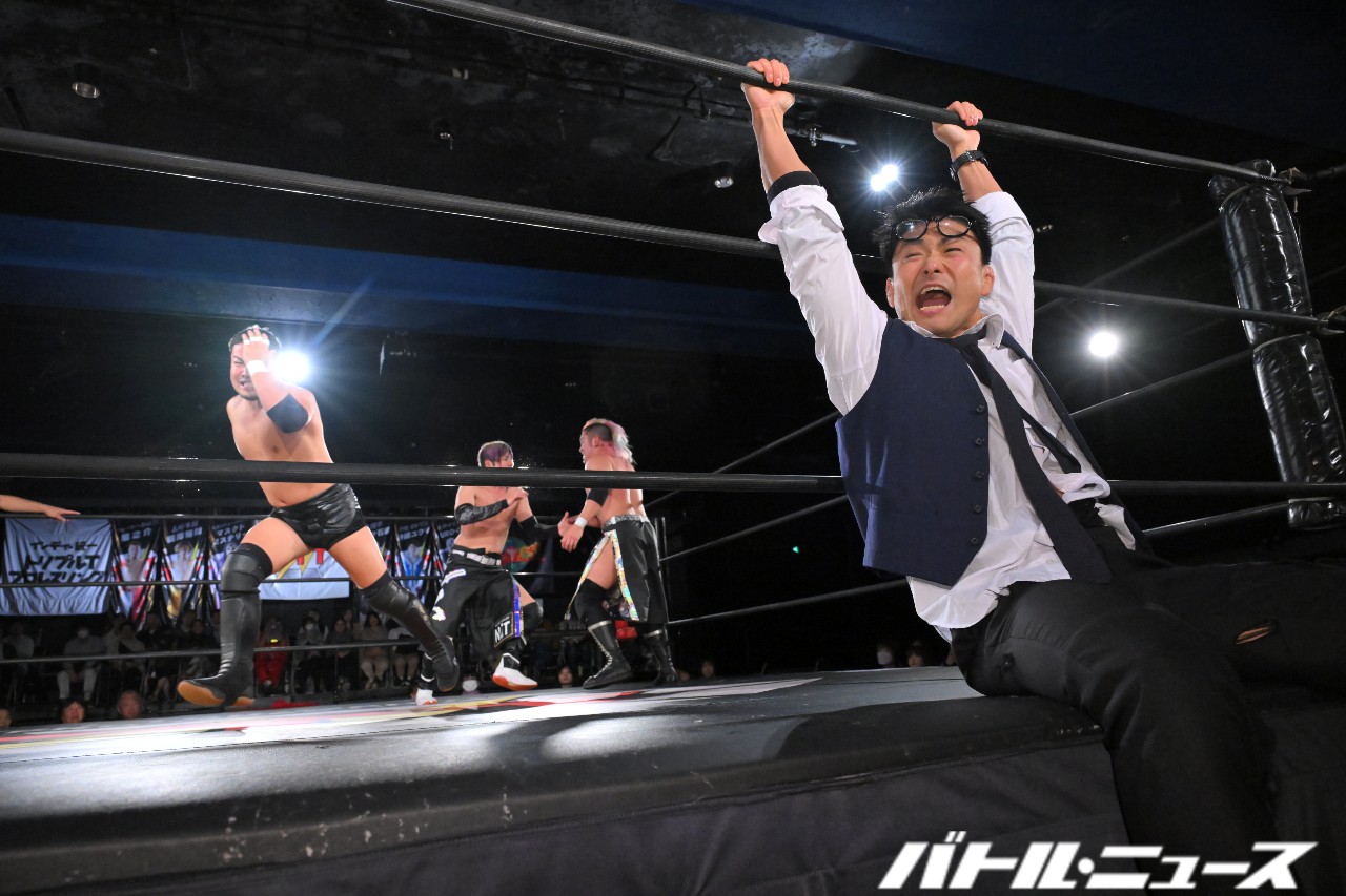 滝澤と藤田の対面。滝澤が足払いからロープに飛んでティヘラ。藤田のゴキブリマスクの触覚を引っ張りつつロープに飛ぶが、綾斗がエプロンからキックを見舞って妨害。場内は綾斗に大ブーイングを贈り、綾斗が「なにがブーや!こういうのもあるやろプロレスって?!やかましいわ!」とキレ散らかすが、藤田も「反則だろうがコノヤロー!」と怒声を上げる。