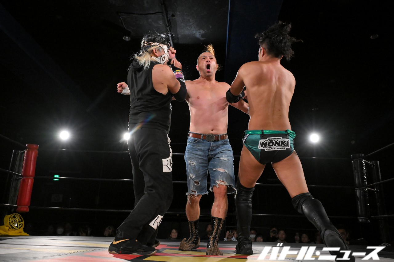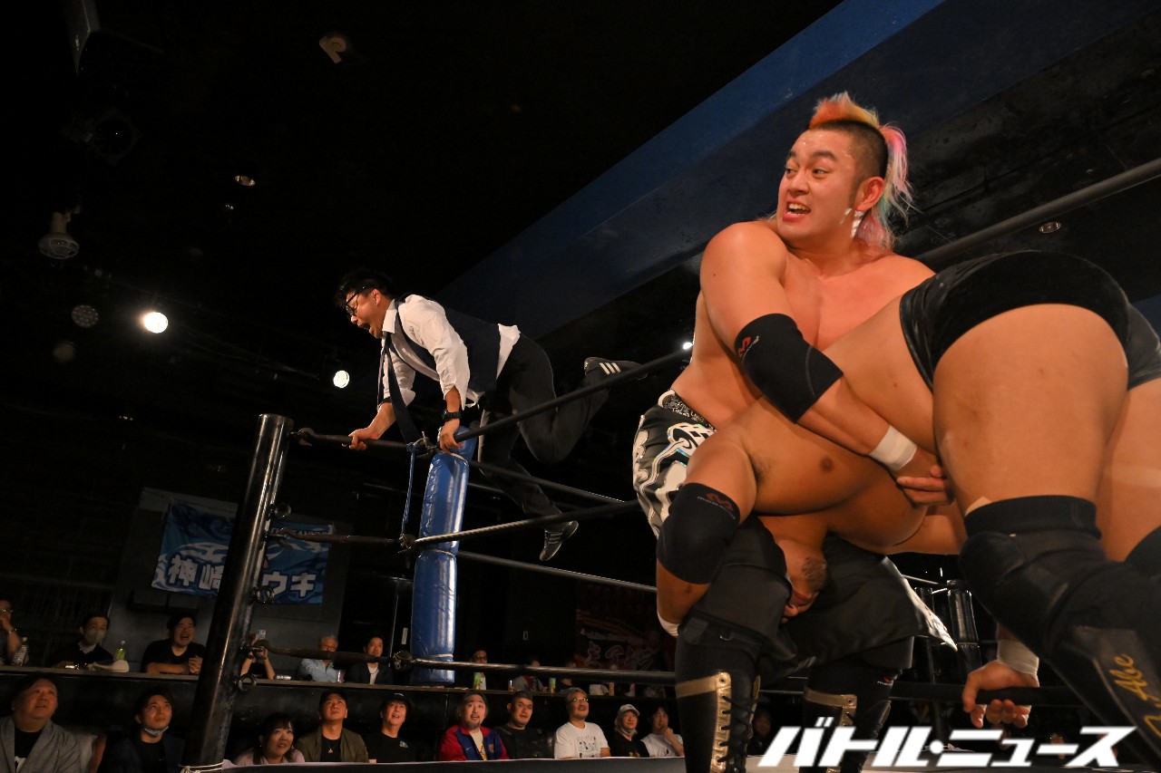 オースギ&千賀は神野にダブルドロップキックを見舞うも、神野が逆水平チョップで2人を圧倒。神野がオースギにパワーボムを狙うが、オースギがDDTで切り返す。