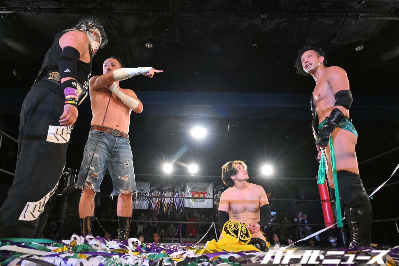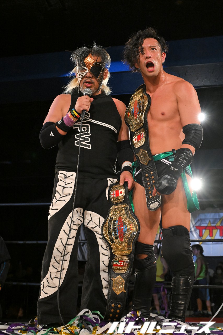 藤田「ゴキブリから解放された藤田と、ゴキブリになったよっちゃんが!TTTのタッグチャンピオンになりました!ベルトを獲ったからには毎月でもタイトルマッチやってやるぞ。来月もタイトルマッチやってやる。挑戦したい奴いっぱいいるだろ?やってや……」