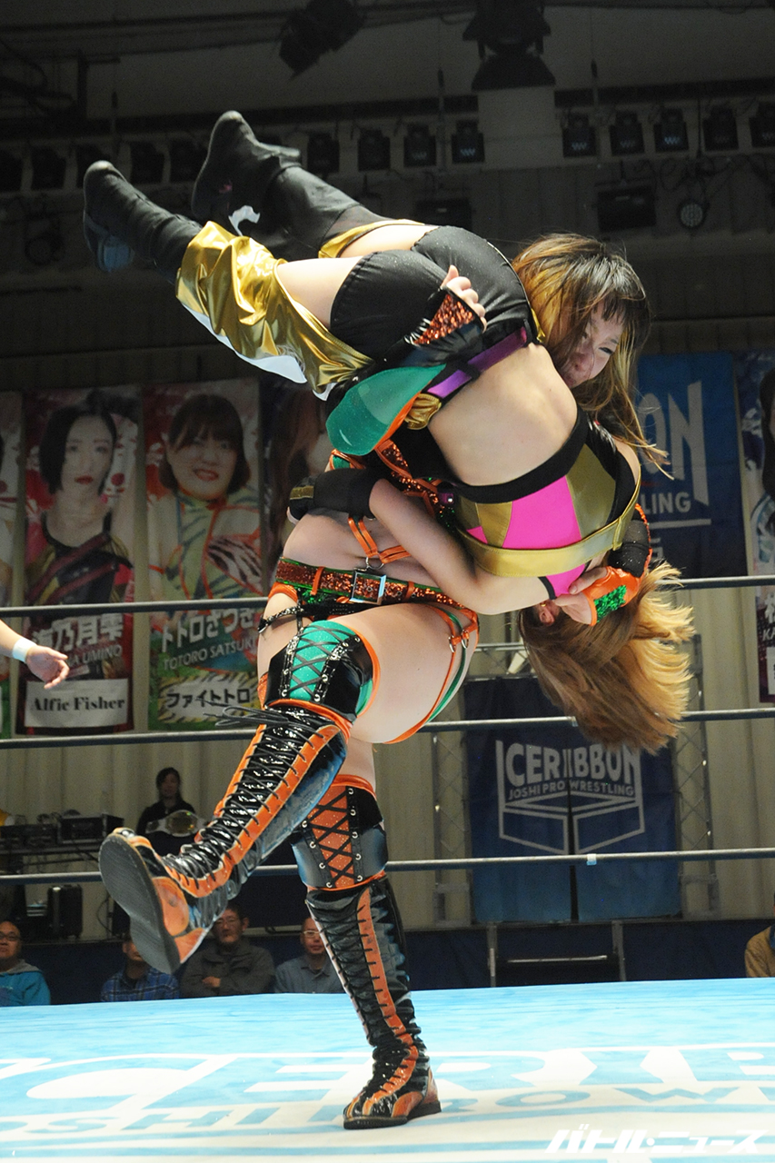リング内外が混沌とする中で、あかねのバックリップを切り返した海乃がバックドロップから攻め込もうとするが、あかねがカウンターのみかんでポン(変形ファルコンアロー)から顔面にナックル。ならばと海乃がリバース・フロッグスプラッシュからフロッグスプラッシュを投下するも、あかねが剣山で迎撃するとヘッドバッドからみかんでポン。海乃はビーナスシュートを狙うが、これをコーナーで担いだあかねがパワーボムで叩きつけ、最後はP-ガイストで突き刺し3カウントを奪った。