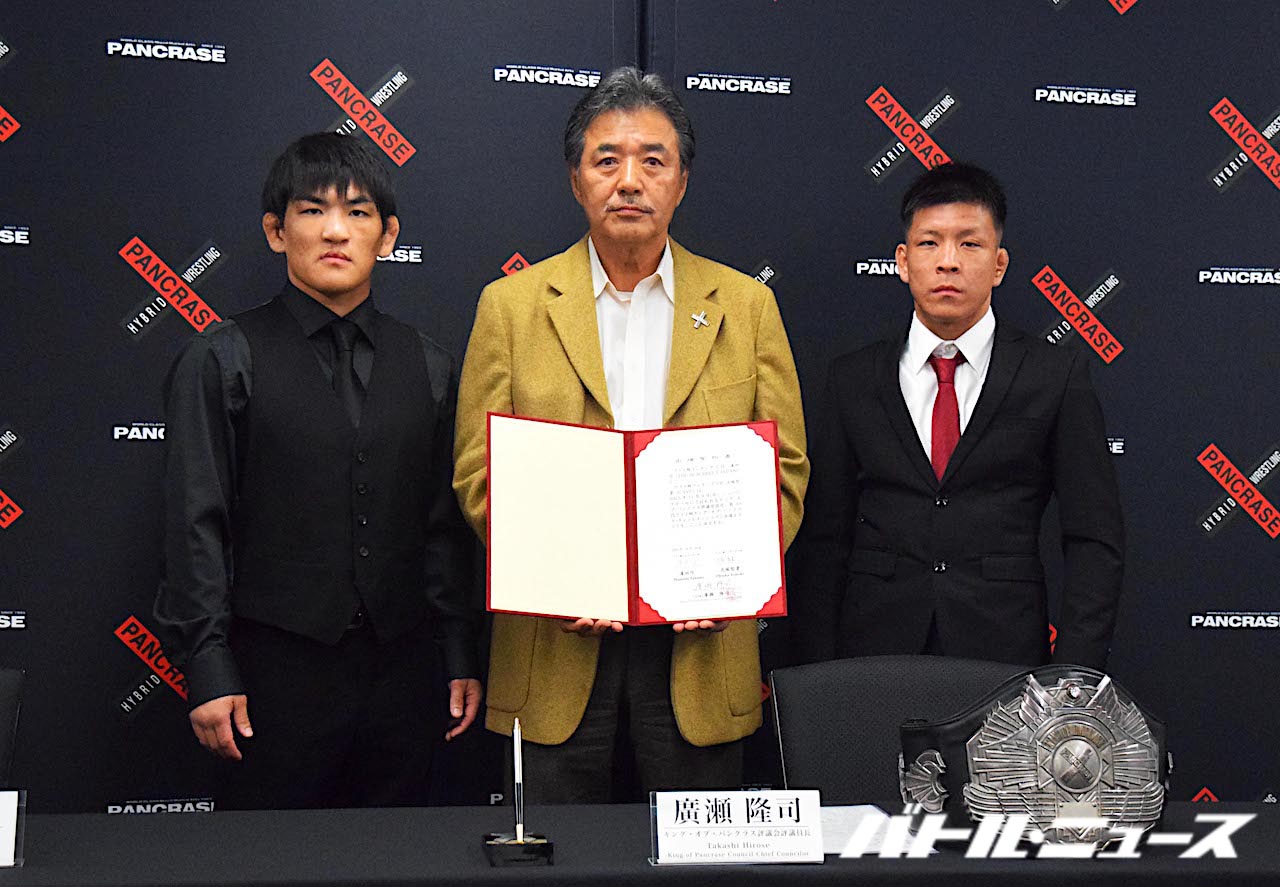 質疑応答終了後、両選手は廣瀬隆司・パンクラス評議委員長の立ち合いのもと、出場誓約書にサイン。シルバーのベルトの前で、新たな闘志を燃やした。