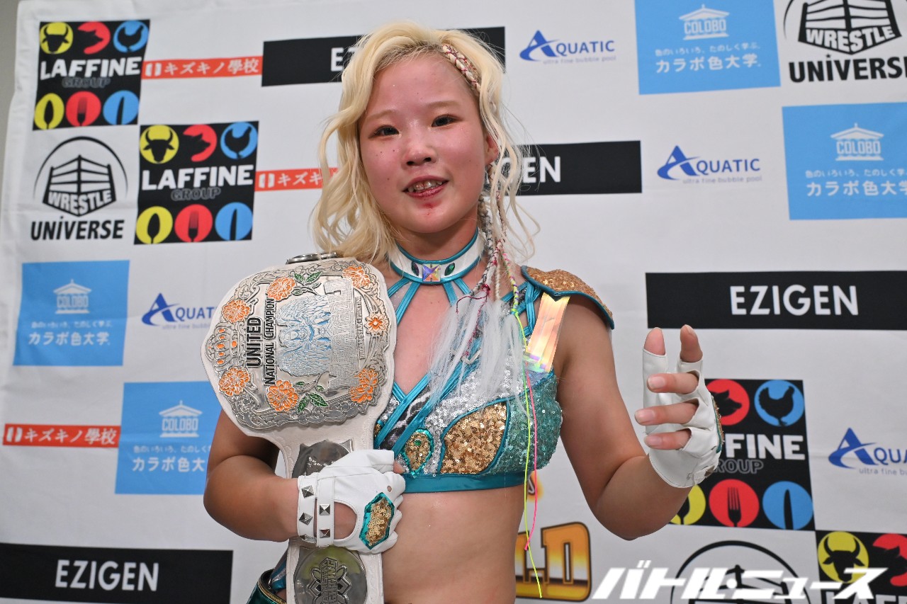 マイクを取った弓月は「私は来月でデビュー2年目を迎えます。この結果は、私が勢いだけで勝ち取ったベルトじゃなくて、これまでプロレスに対する思い、プロレスに対する情熱、それを注ぎ込んできたから、誰よりも注ぎ込んできたから、私は、この結果になったと思ってます。桜井さん、私は桜井さんがこれまで築いてきたユナイテッドナショナルのベルトの歴史を、私が今度は受け継いでいきます。今日は本当にありがとうございました」と深々と一礼。弓月と桜井は向かい合って座礼を交わし、桜井が弓月の腰にベルトを巻いた。