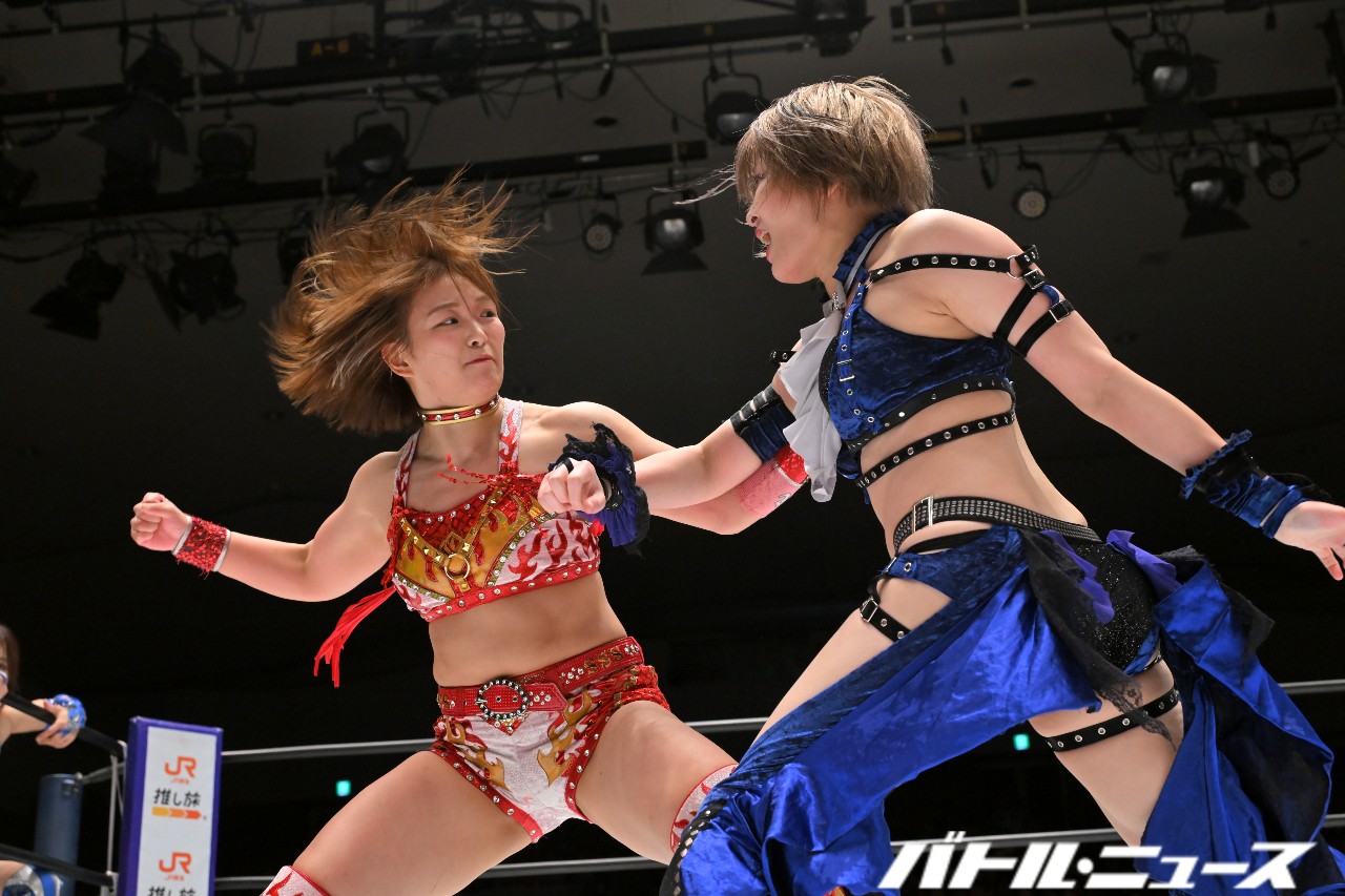 Sareeeと安納が真っ向からのエルボー合戦を展開して場内を沸かせ、ジャーマン・スープレックスで投げ合う意地の張り合いを展開。続く水森も自慢のパワーを発揮してSareeeを追い込み、強烈なラリアットで叩き伏せてあと一歩のところまで追い込む。