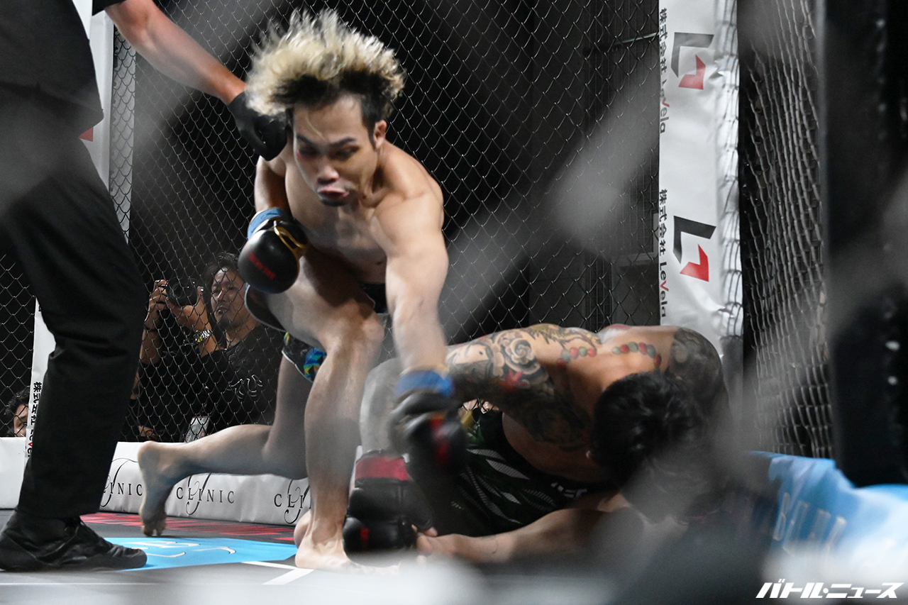 試合開始直後にボクが飛び膝蹴りも浅い。お互い距離を見合い、ボクがストレートを打ち込みミドルから組み合いへ。一度レフェリーが引き剥がし、ボクが前に出るがシューがカウンターのフック。ボクが前に出るがケージ際のためブレイク。