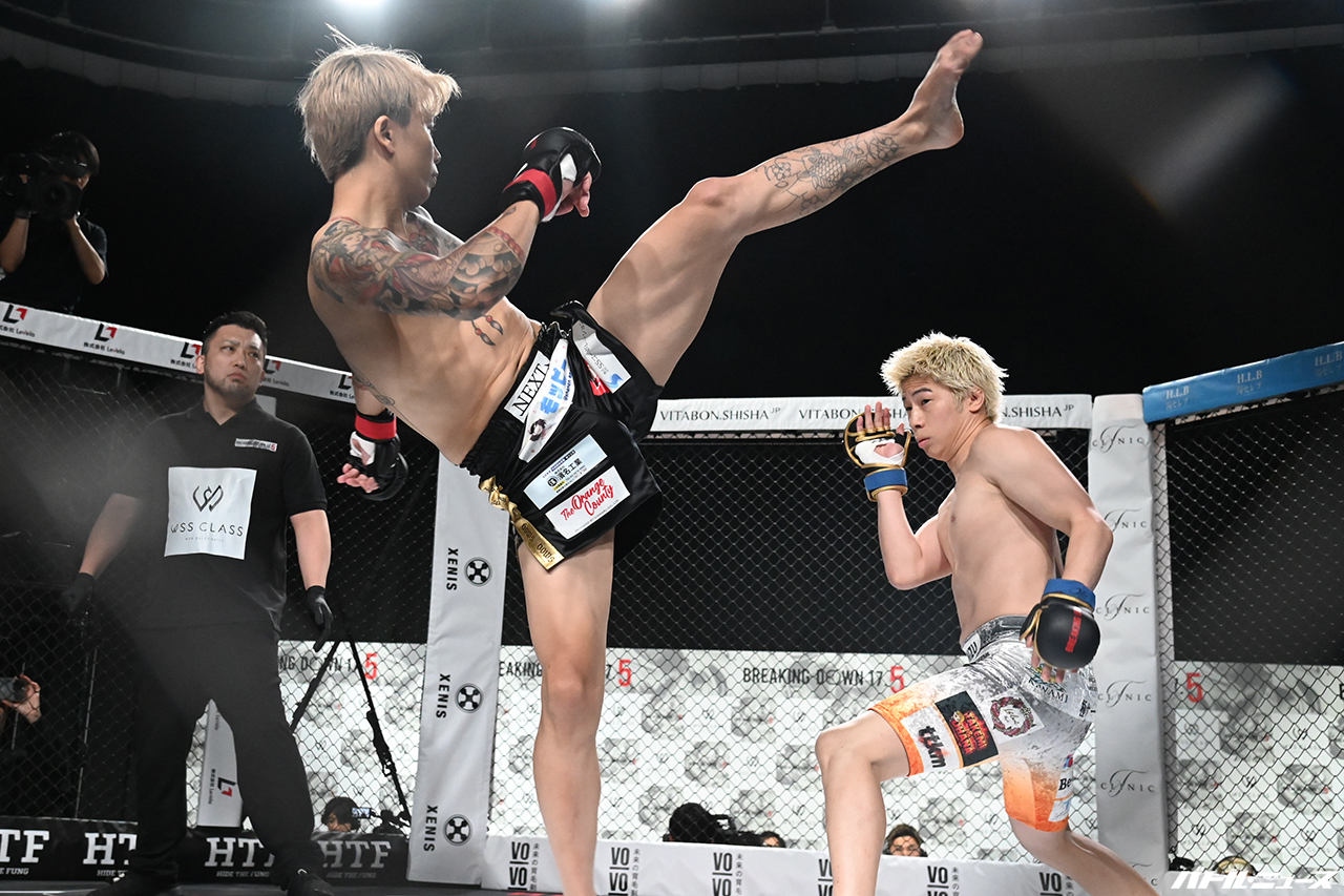 龍志はブラジリアンキックからソバット。ガードした竹見にローから回し蹴りを叩き込み、竹見は前に出ることができずに時間切れ。
