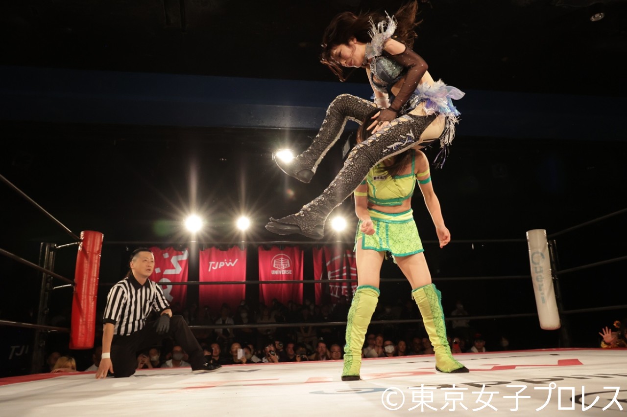 東京女子プロレスが11月1日、東京・新宿FACEで『TJPW Autumn Victory in SHINJUKU vol.2』を開催した。9日の後楽園ホールで行われるプリンセスタッグ選手権試合(王者組=上福ゆき&上原わかな《Over Eats》vs挑戦者組=HIMAWARI&鈴木志乃《Bumping gRitters》)、インターナショナル・プリンセス選手権試合(王者=遠藤有栖vs挑戦者=高見汐珠)のダブル前哨戦が王者組vs挑戦者組による6人タッグ戦で実施され、王者組が完勝した。