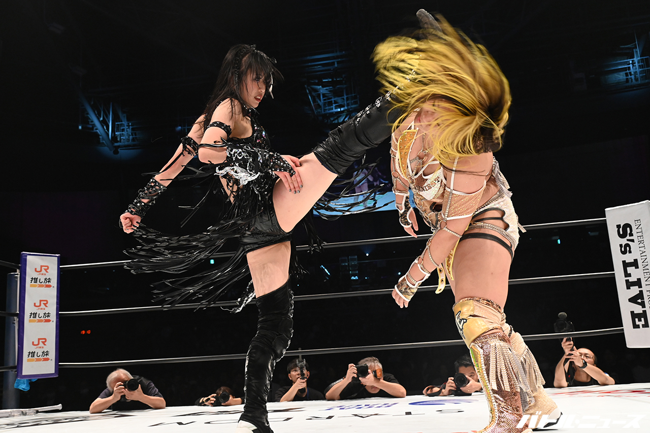 試合序盤は桃が蹴りとエルボーで厳しい攻めを見せ、上谷の攻撃を受けきっていく。桃がサミングを見せれば上谷はレフェリーを盾にして反撃に転じ、ならばと桃はバットを足にフルスイングしてケブラーダを阻止。さらにエプロンへのBドライバーで突き刺すも、上谷は場外への奈落式フランケンで自分もろとも落下し大ダメージ。
