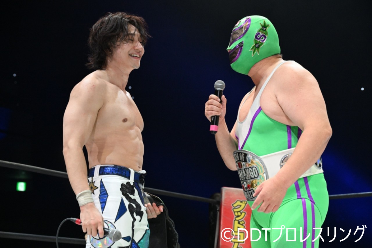 鈴木が退場すると、上野は「シングルのベルト、2本獲ることができてやりたいことがあります。一つ目は、僕のプロレスで、僕たちの力でみんなに活力を与えること。プロレス見たら、しんどいことも楽しくなったり、楽しい日がもっと楽しくなります。僕は2人分のチャンピオンとして、みんなにたくさんエネルギーを届けます。そして、もう一つ。僕はDDTの仲間とみんなで東京ドームに行きたい! まだ遠い夢だけど、毎週末、いっぱいのエネルギーのある試合になって、毎月の後楽園もいっぱいになって、両国もいっぱいになって、みんなの力の出る場所になります。それを一人ひとりに届け続けて、東京ドームに行くために、チャンピオンとしてめちゃくちゃ頑張ります」と2つの目標を掲げた。