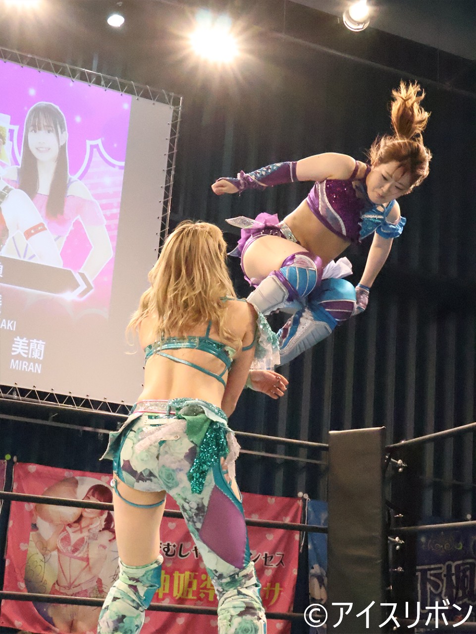 神姫楽がカウンターのタックル、エルボードロップを決め、セントーンもこれは美蘭がかわす。膝立ちの神姫楽に美蘭が正面ドロップキック。美蘭が飛び込むも神姫楽がキャッチしてボディスラム。カバーもカウント2。