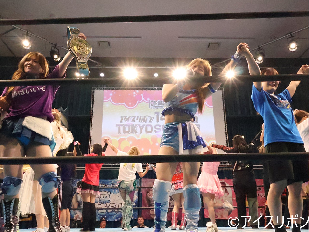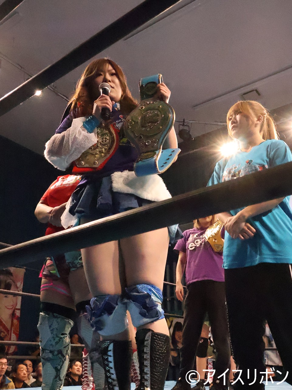 ※握手回り終わりで、きらりが再びマイクを持ち、「私が次期挑戦者決定ということで、必ず後楽園で防衛戦をするので、皆さん、楽しみにお待ちください。きらりの限界突破、見届けろーっ!」とアピールし、きらりが「プロレスでハッピー!アイスリボーン!」で大会を締めた。