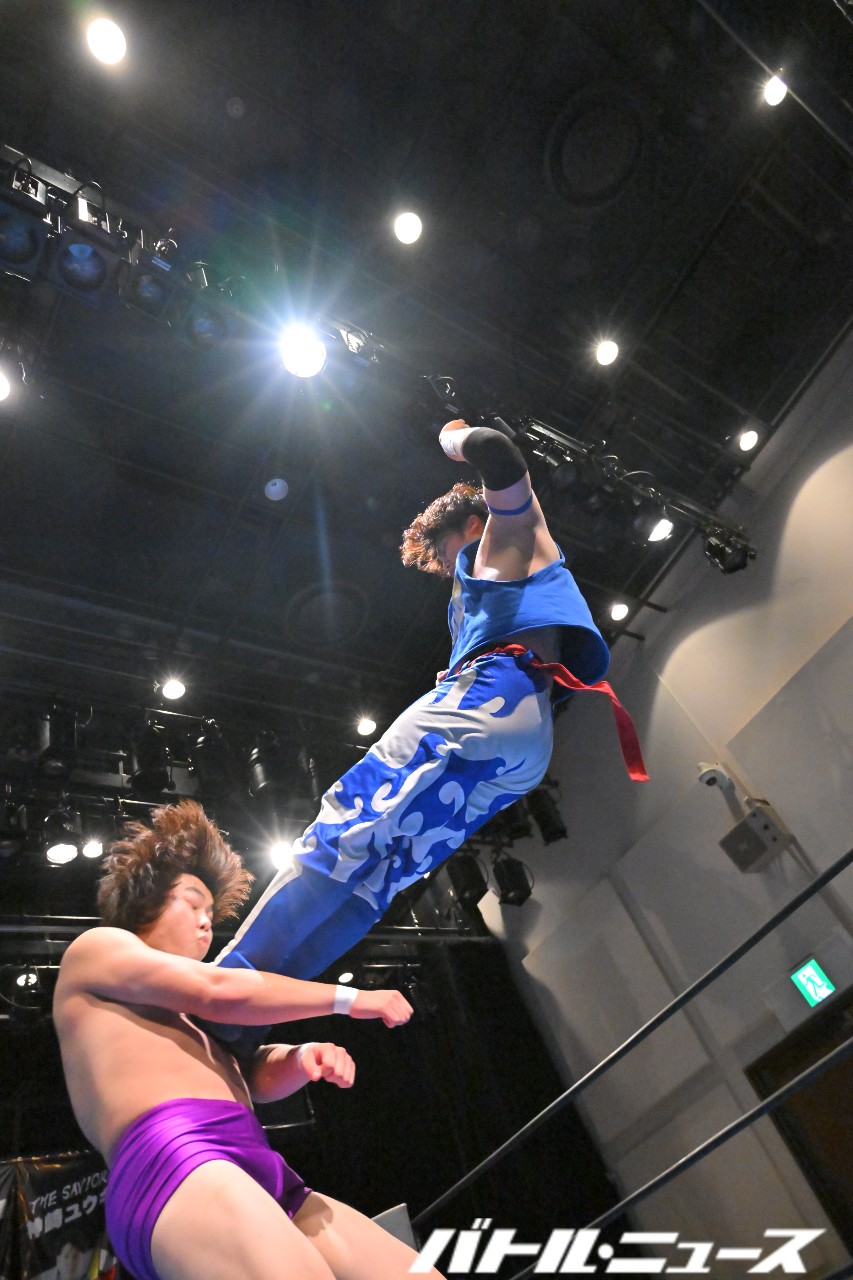 橋之介と千賀の対面。素早いロープワークの応酬から橋之介がヒップトスからの側転低空ドロップキックで先制。真琴にタッチ。