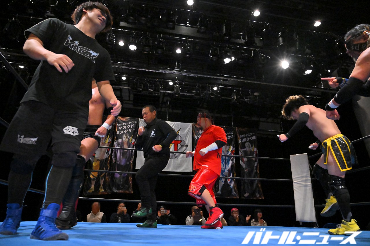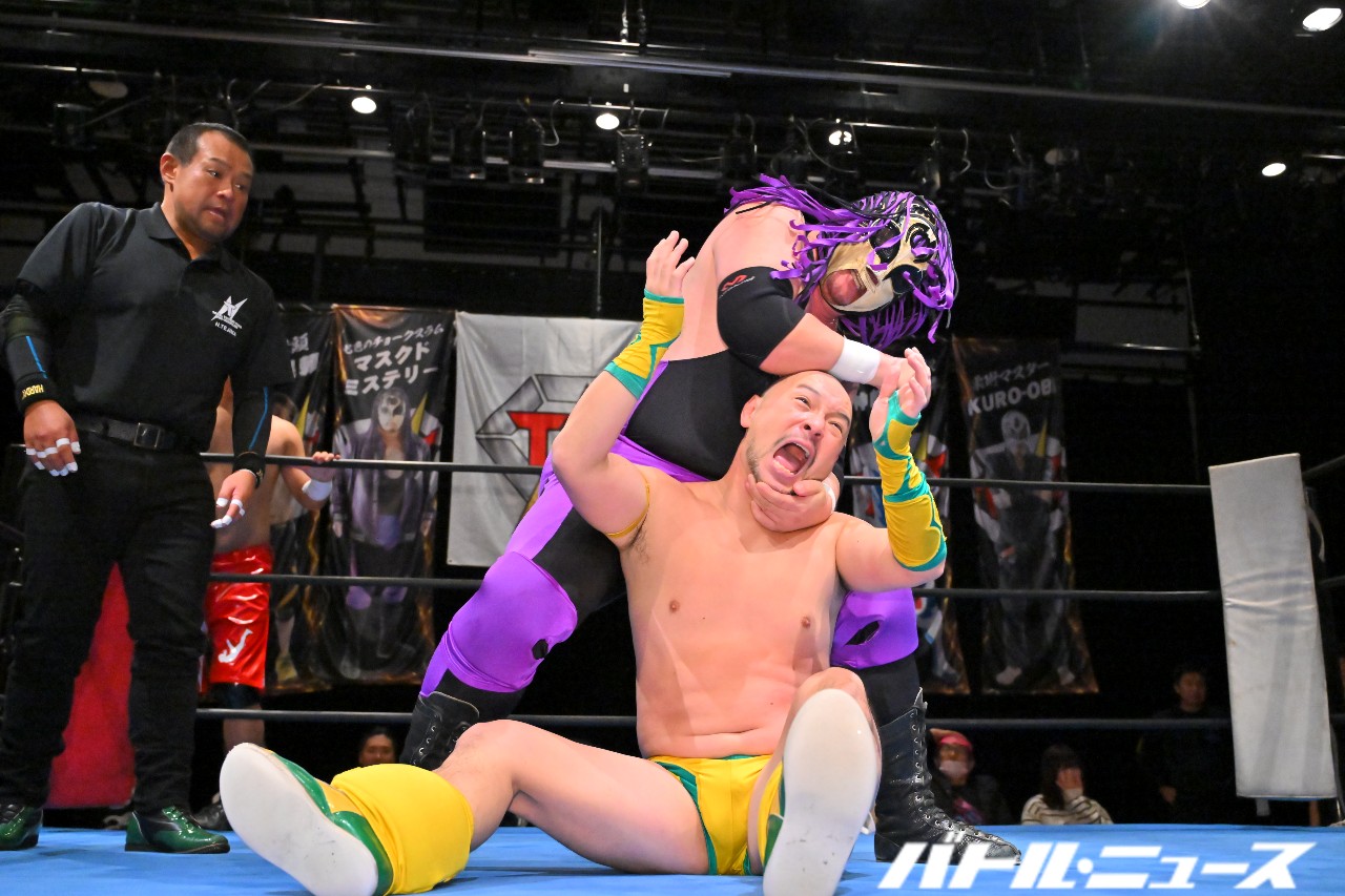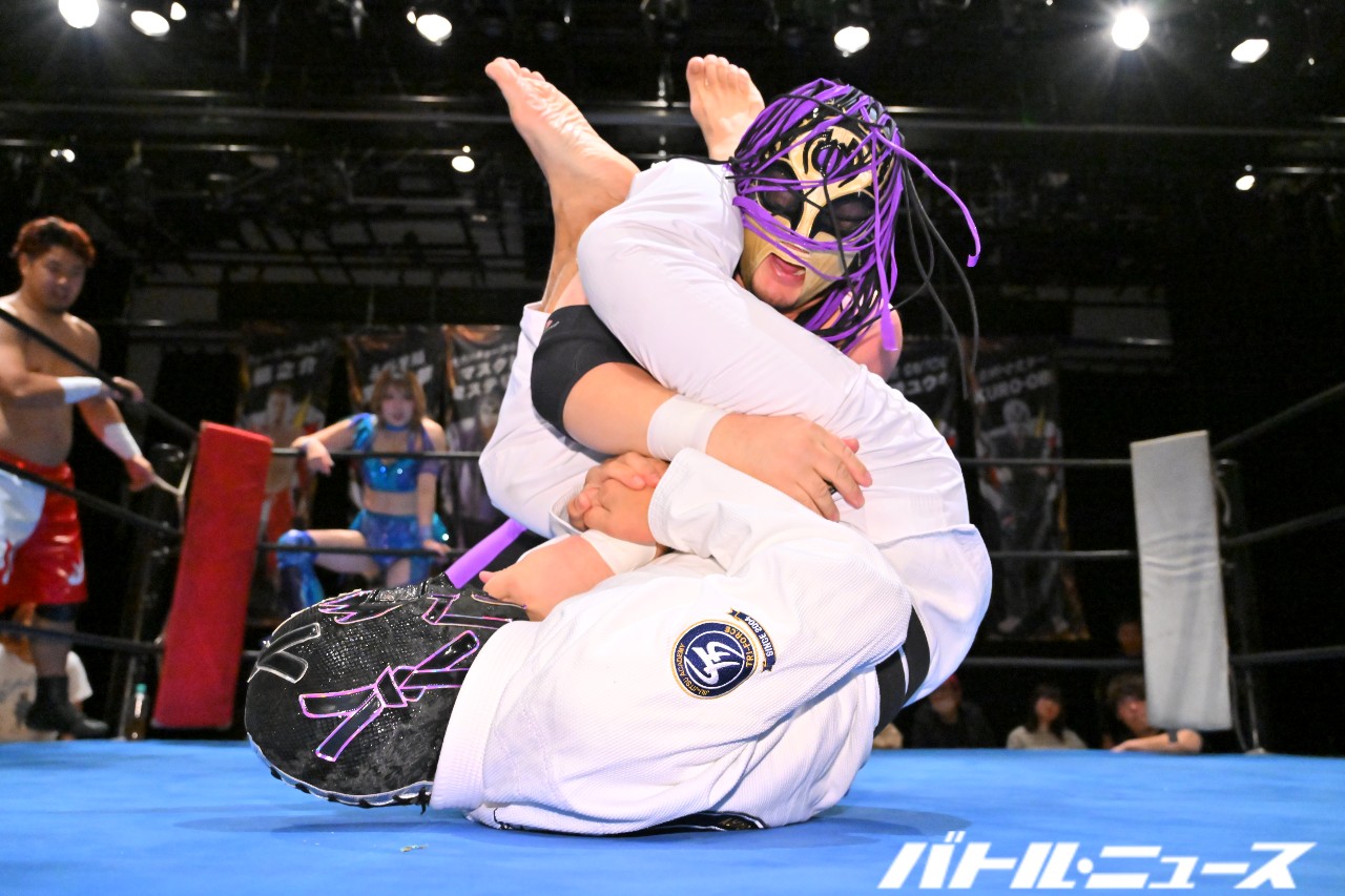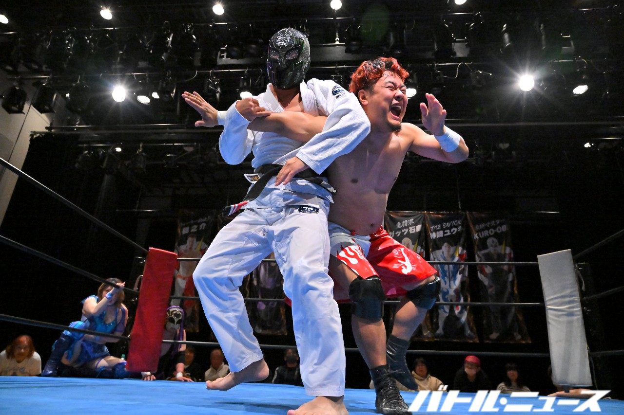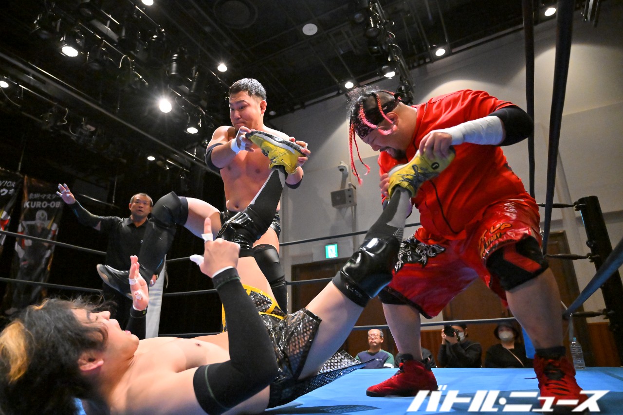 橋之介がKURO-OBIにエルボーを連打していくが、キャッチしたKURO-OBIが脇固め。さらにスリーパーホールドで捕らえている間に千賀&塚本が黒帯で橋之介を拘束。塚本の小内刈り+千賀&KURO-OBIのクロスチョップの合体攻撃。