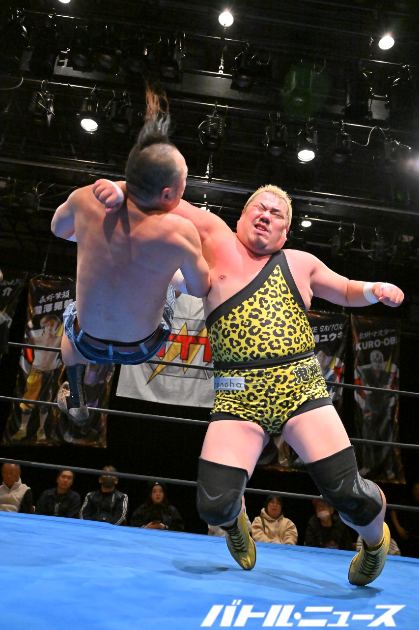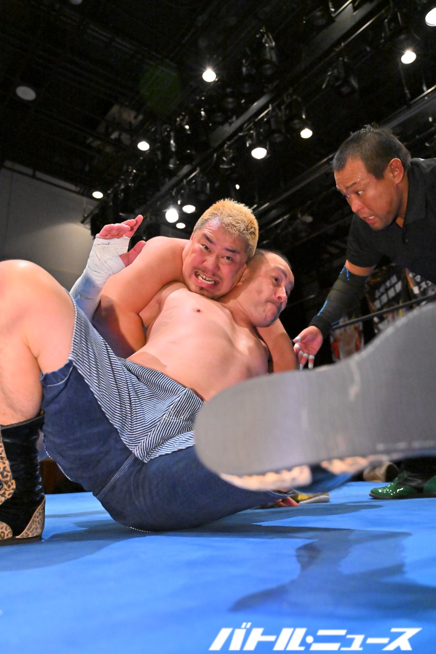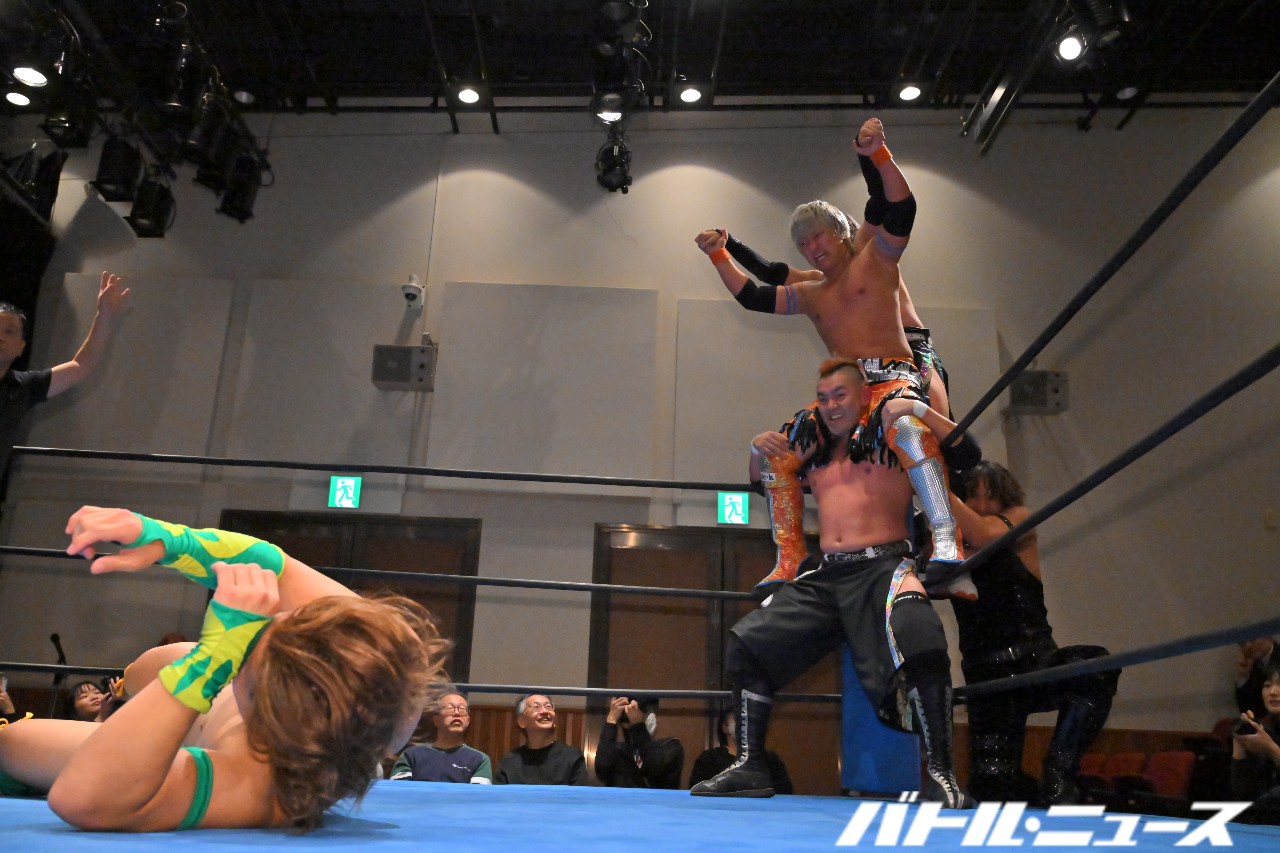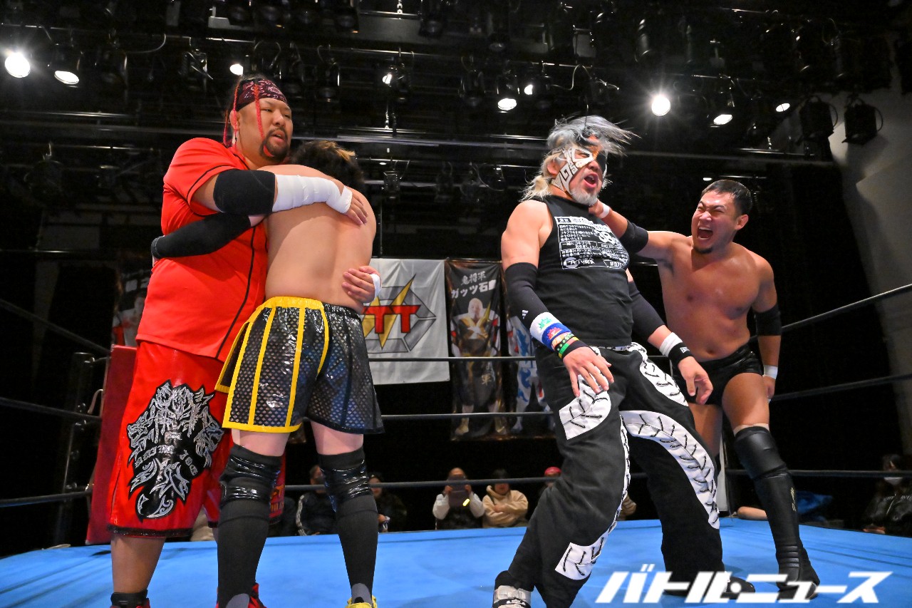 橋之介がKURO-OBIにエルボーを連打していくが、キャッチしたKURO-OBIが脇固め。さらにスリーパーホールドで捕らえている間に千賀&塚本が黒帯で橋之介を拘束。塚本の小内刈り+千賀&KURO-OBIのクロスチョップの合体攻撃。
