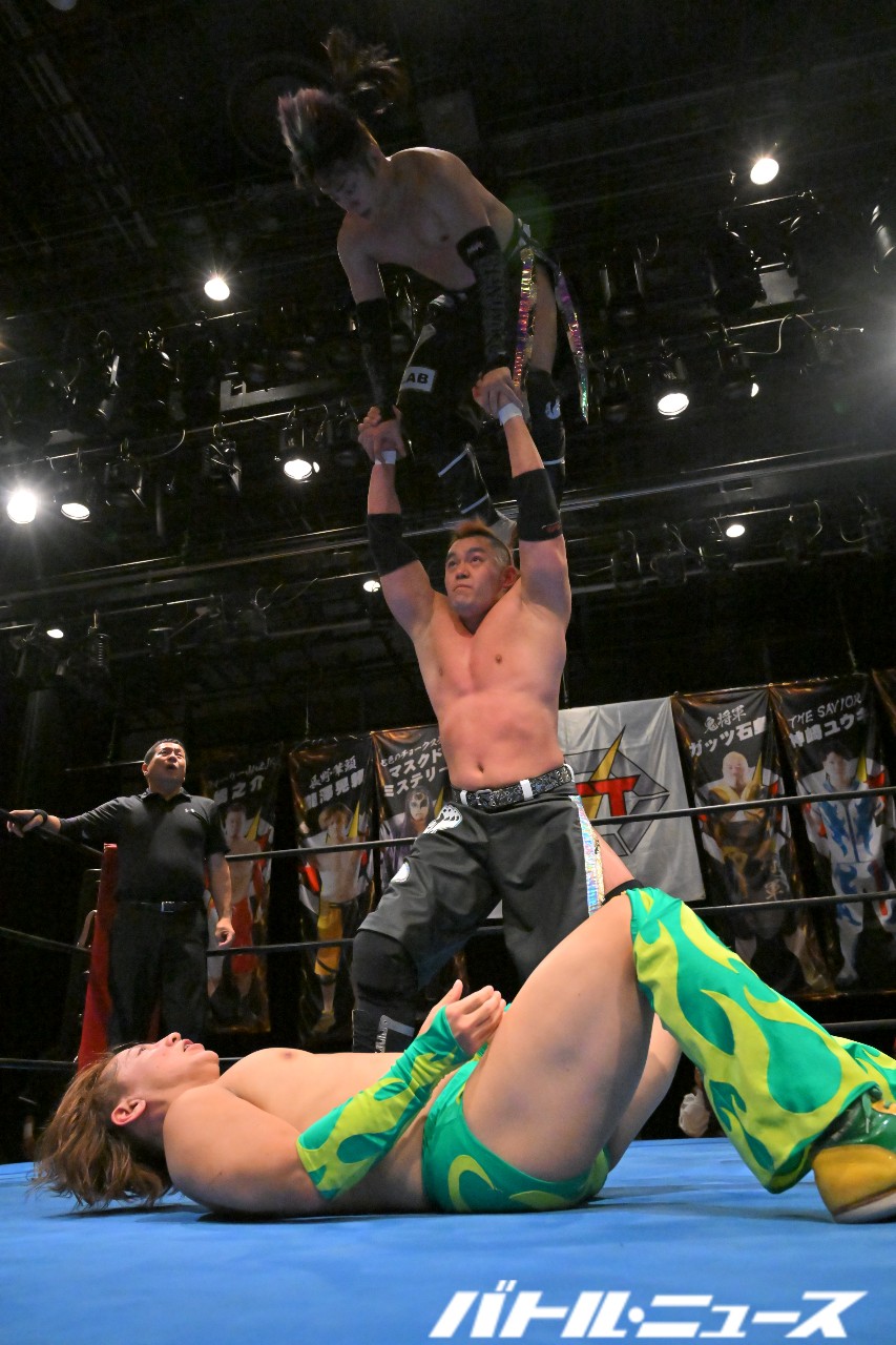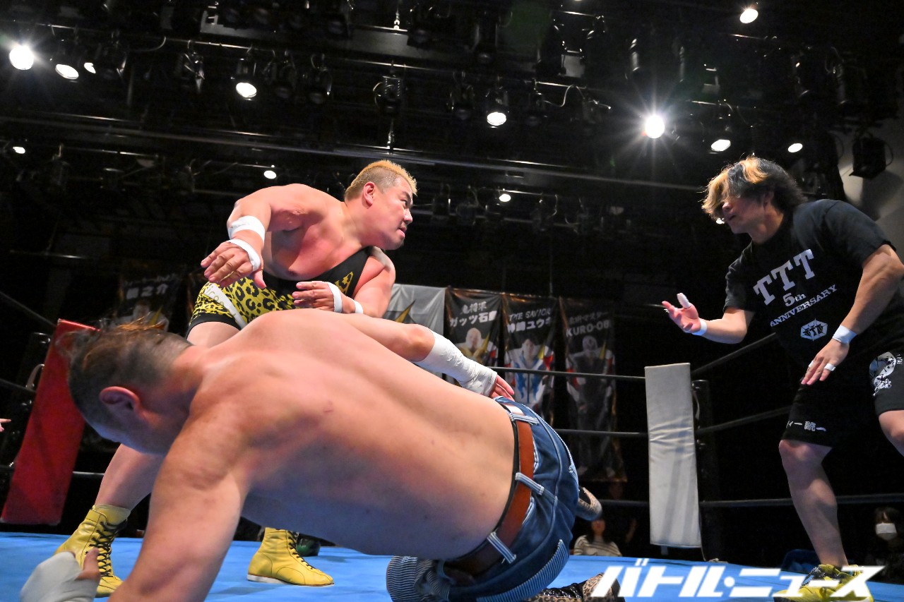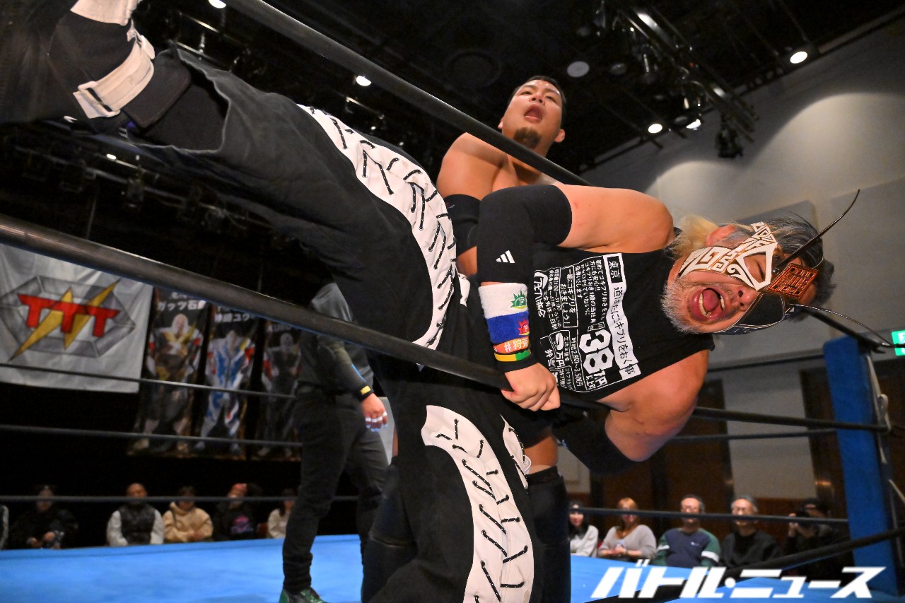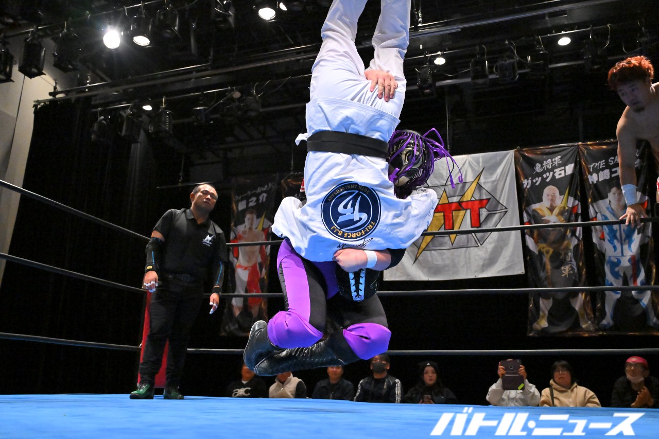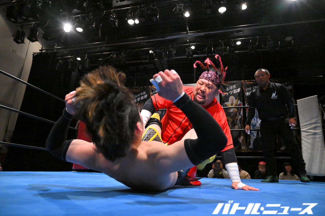 橋之介がKURO-OBIにエルボーを連打していくが、キャッチしたKURO-OBIが脇固め。さらにスリーパーホールドで捕らえている間に千賀&塚本が黒帯で橋之介を拘束。塚本の小内刈り+千賀&KURO-OBIのクロスチョップの合体攻撃。