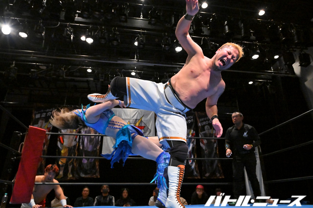 KURO-OBIが橋之介に突っ込んでいくが、橋之介がかわして延髄切り。さらに真琴がスピアーを突き刺し、ミステリーが暗闇脳天落とし。トドメとばかりに橋之介がスワントーン・ボムを投下するも、これがまさかのカウント2。