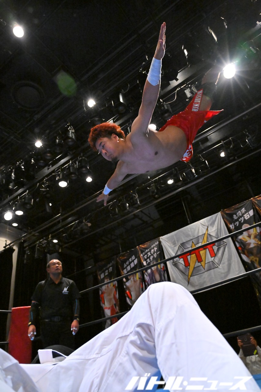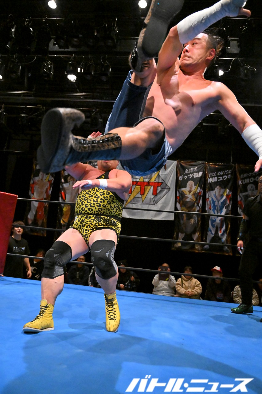 秀旺がリングに戻ると、ガッツは逆水平チョップを連打。秀旺の金的攻撃も読み切ってガードし、ボディスラムから鬼神ナックル。ロープへ振ってのバックエルボーで倒して「立てコラ!」と鬼神咆哮。しかし、秀旺はわざと後方へ倒れながら足を振り上げてガッツに急所蹴り。