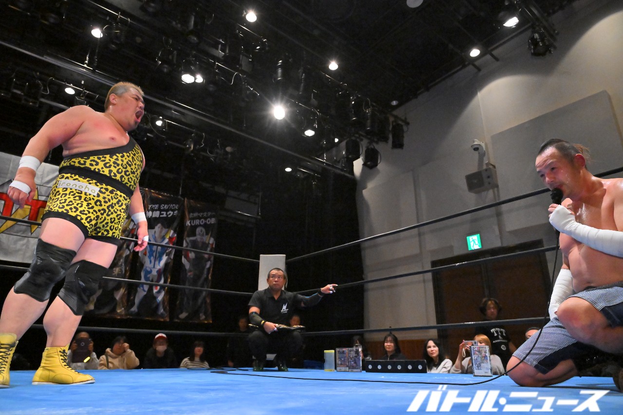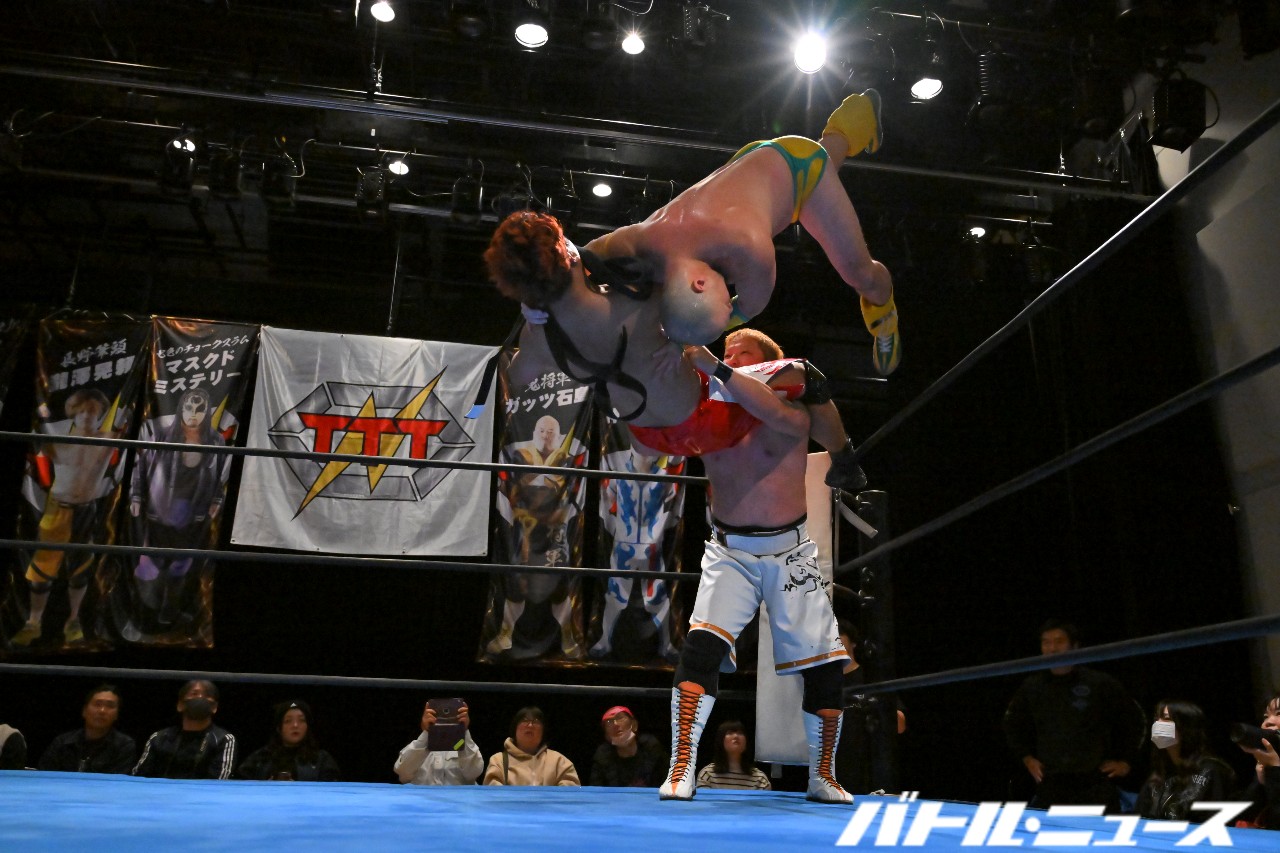 しかし、松澤さんに剥き出しの性欲を向け続けてきたバナナ千賀が突然現れ、松澤さんからベルトを奪った新王者組に逆恨みの挑戦表明。空手黒帯(自称)の千賀、柔術黒帯のKURO-OBI、柔道黒帯の塚本拓海という実力派が揃った【黒帯軍団】にて11月3日のTTT新大久保大会(R'sアートコート大会)で挑戦することが決まった。