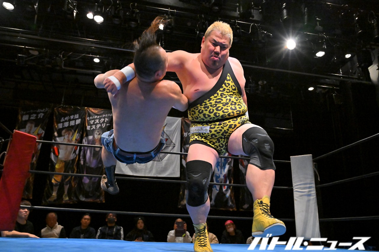 橋之介は千賀にヒザ裏へのキックからボディスラム。ミステリーにタッチ。