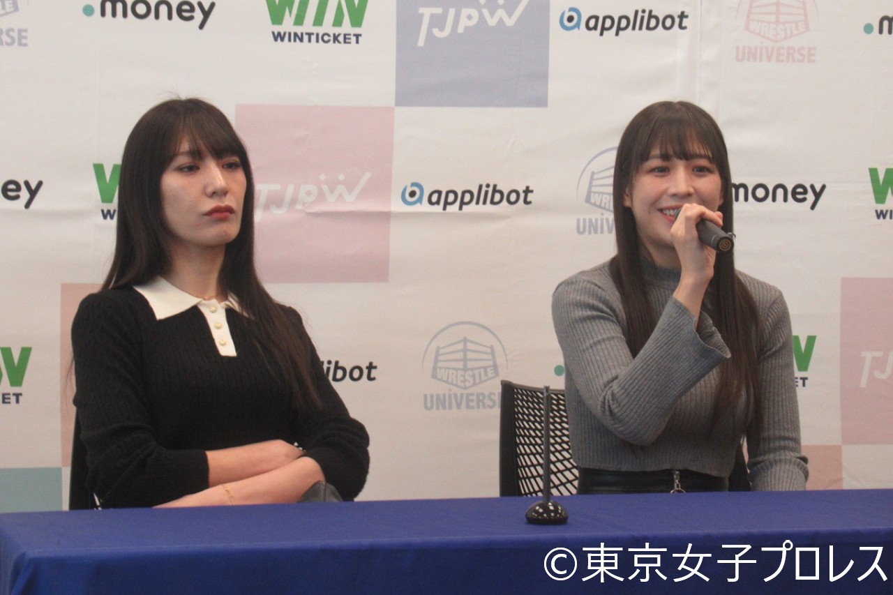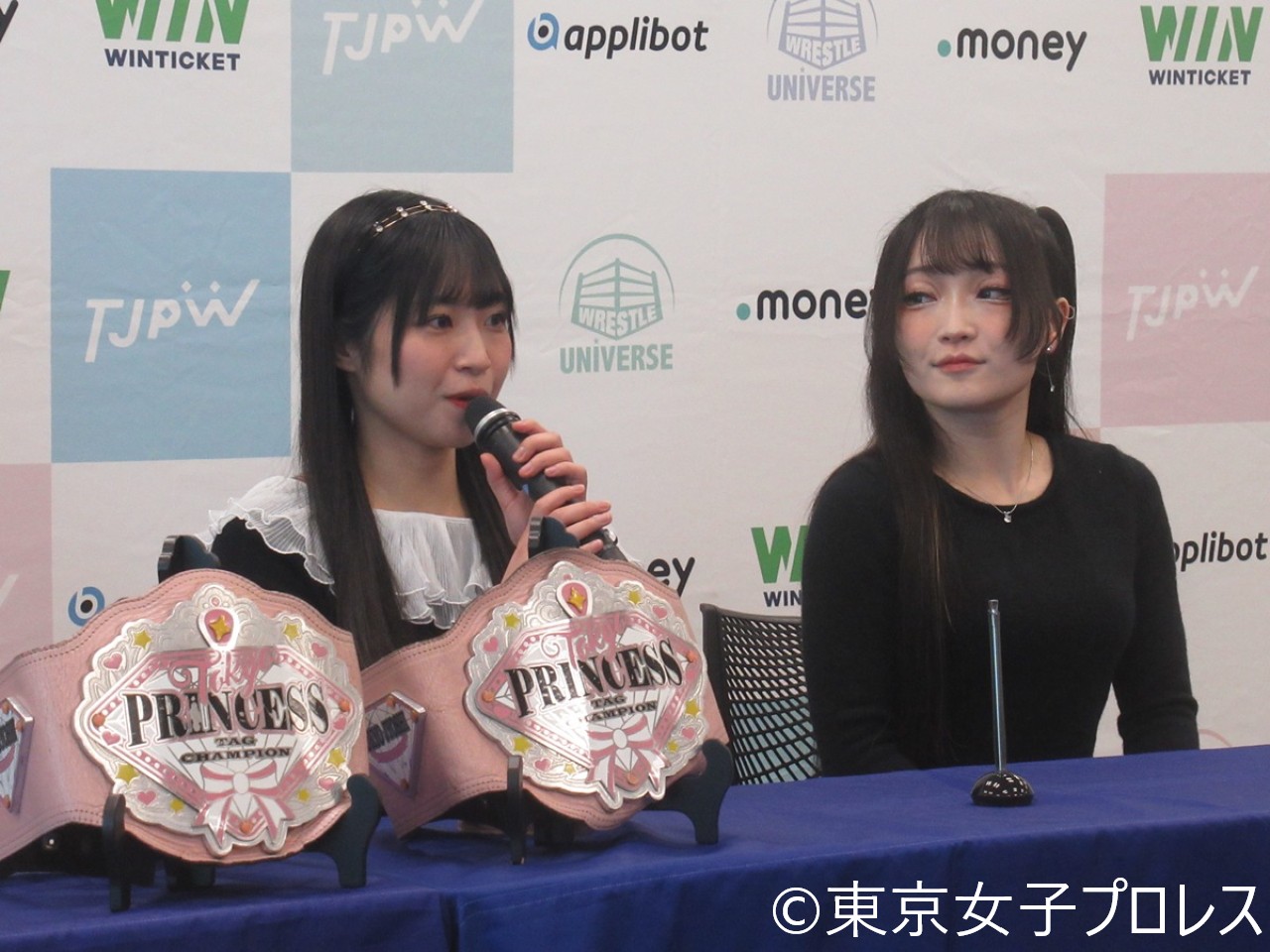 挑戦者組の鈴木は「今回、同期であるわかなさんがベルトを獲られて、私が一番に思ったことは同期がベルトを獲ることはうれしいとともに、とても悔しいんだなと感じました。そして、その後にHot Shot(まなせゆうな&凍雅)で同期の凍雅ちゃんのチームがベルトに挑戦して。同期たちがベルトを巡って熱く戦っている中で、自分たちが仲間に入れなくてというか、まったく関係ないところにいるのがすごく悔しくて。でも私は結果を何も出してなくて、ベルトに挑戦するって口に出すことが今までなかったんです。でも、挑戦するって思った日に勝つことができて、その時、隣にHIMAWARIさんがいてくれて。私たちはタッグトーナメントに一緒に出たり、大切な時にいつもHIMAWARIさんは隣にいてくれて。そしてその日は勝って、今なら挑戦できると思って、こうやって挑戦表明しました。それが同期だけじゃなくて、わかなさんの隣が上福さんであろうとも、私は絶対にHIMAWARIさんとベルトが獲れると思って挑戦表明しました。前哨戦もあった中で、この前はボロボロに負けてしまったし、上福さんの(ビッグ)ブーツを受けて体がボロボロになったけど、心は全然まだまだ折れてません。当日は2人を知らない未知の世界にご案内したいと思います。ベルト、絶対に獲ります!」と決意表明。