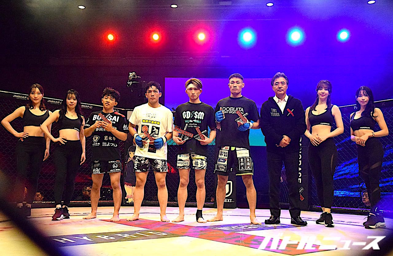 優勝を果たした氏原魁星(ストロー級)、本川ハルアキ(フライ級)、白井誠司(バンタム級)、清水博人(フェザー級)がケージイン。廣瀬隆司・パンクラス評議員長から認定書とトロフィーを授与された。