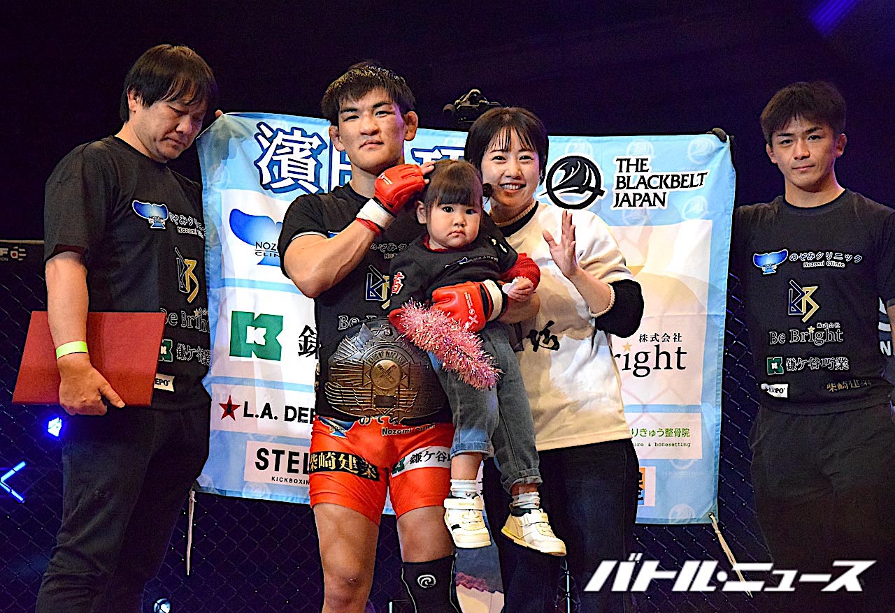 濱田は妻子をケージへ呼び入れ、家族で喜びを分かち合った。