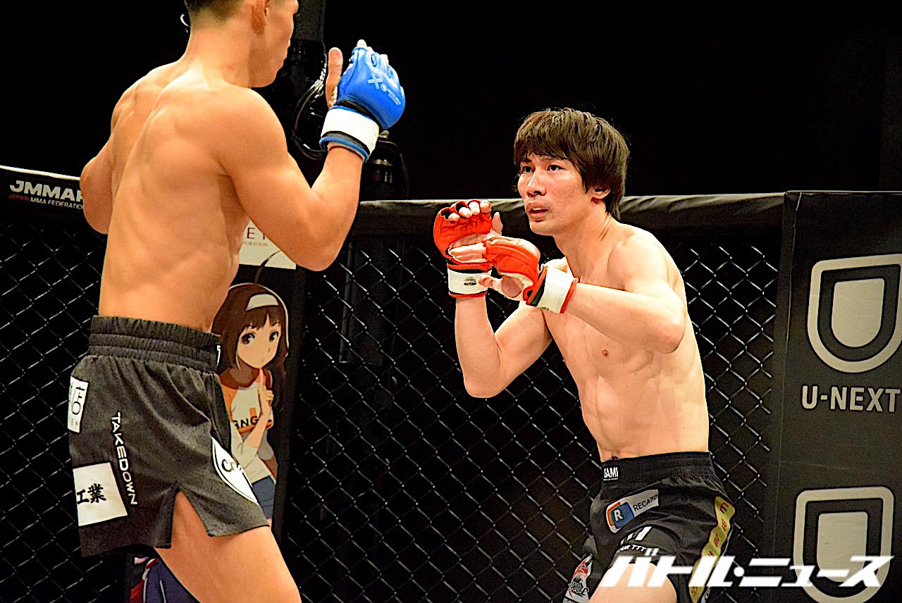 1R。宮澤がタックルに入るが、飯野が切った。宮澤が右のオーバーハンドからからタックル、テイクダウン! 脱出しようとする飯野だが、宮澤は追ってバックを取る。飯野は立ち上がるが、宮澤はバックを取ったまま殴る。そしてヒザ連打。飯野が向き直ると宮澤がテイクダウン。飯野はすぐに立ち上がったが、宮澤がバックに。飯野が正対し離れた。