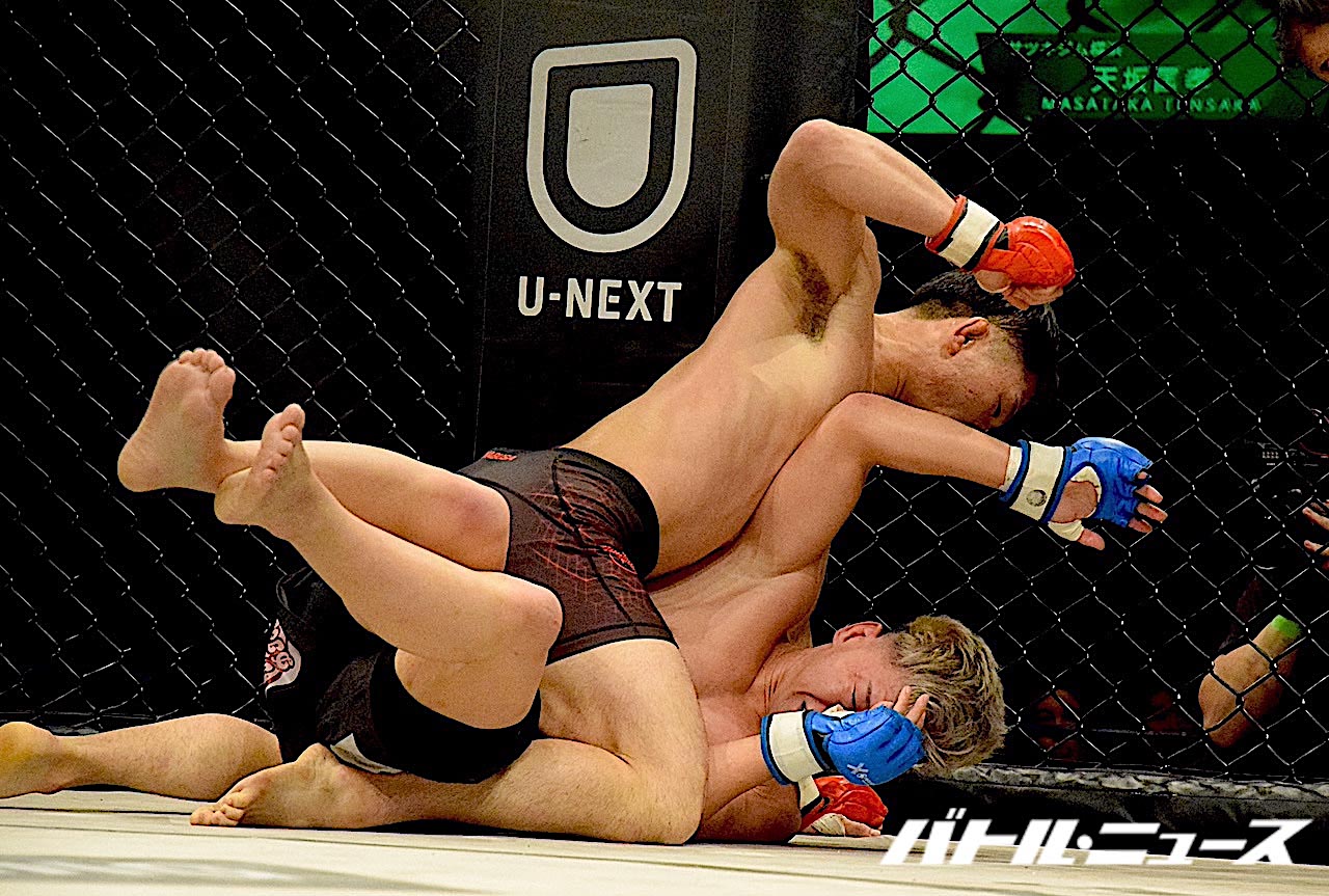 1R。平野がテイクダウン。天坂はガード。天坂が下から殴り、オモプラッタへ。これは外れるが、すぐに起き上がりタックルに入る。天坂はさらにバックに回る。平野は殴り、後ろへヒジ。天坂は相手の左足を両足ではさんでいる。左足が抜けない平野。