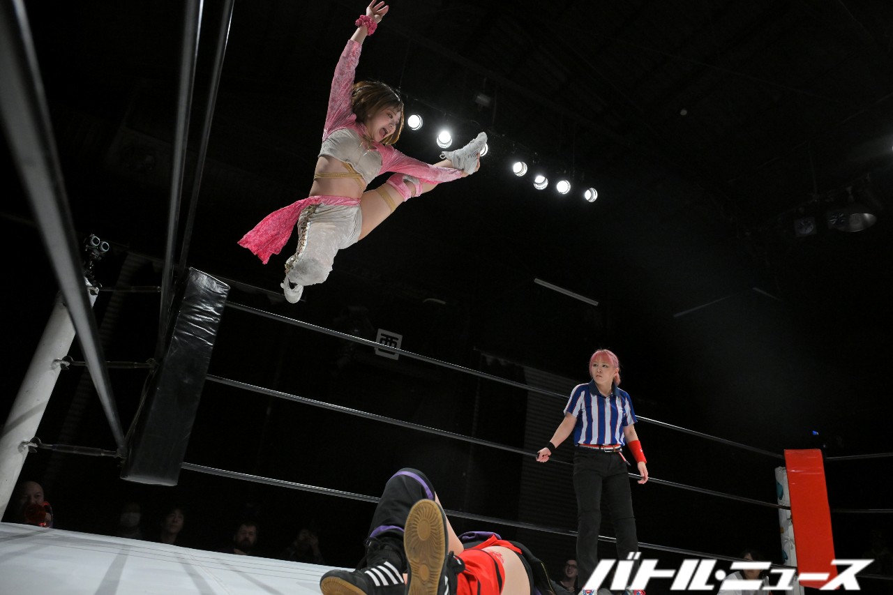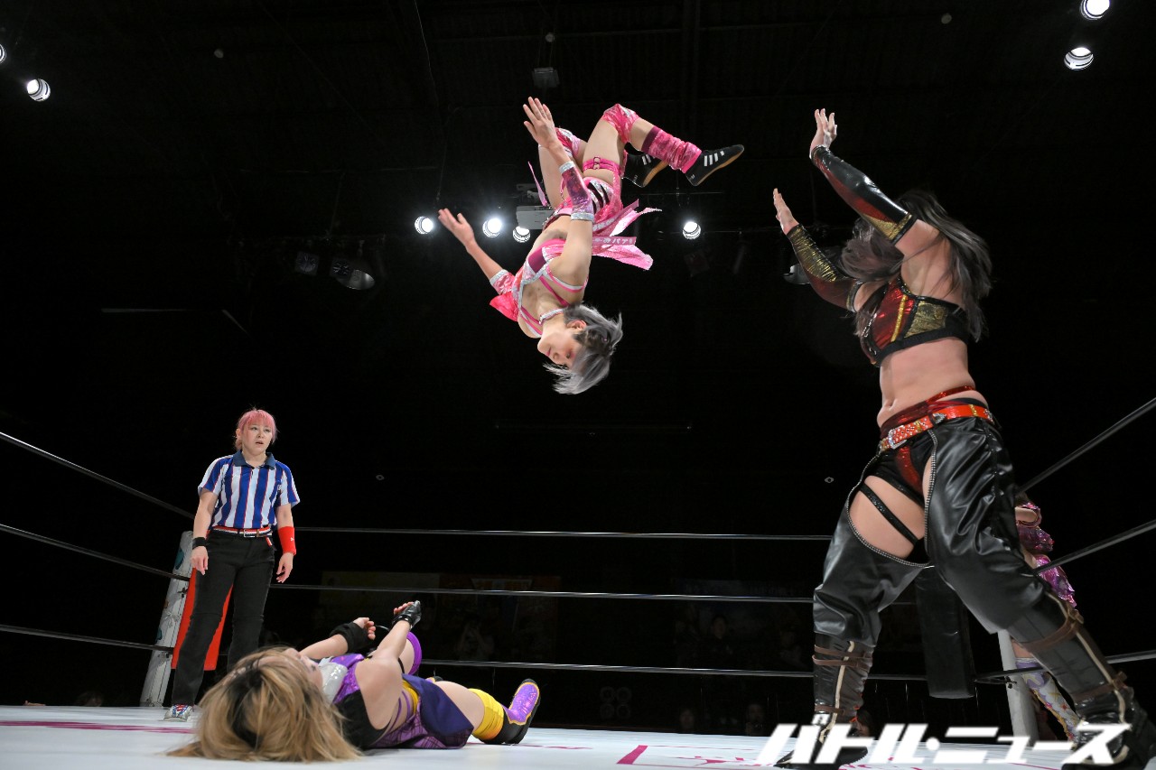 茉莉はハイキックも、朝子が避けてロープに飛ぶとフライングクロスチョップで倒し、なるを呼び込むと2人でロープを往復して茉莉を翻弄し、朝子が雄叫びを上げて気を引くとなるが背後からドロップキック。朝子がチンクラッシャーからロープに飛んでドロップキック。さらにロープに飛んでスライディングクロスボディからオーロラヒップドロップを投下するが2。朝子はなるにタッチ。