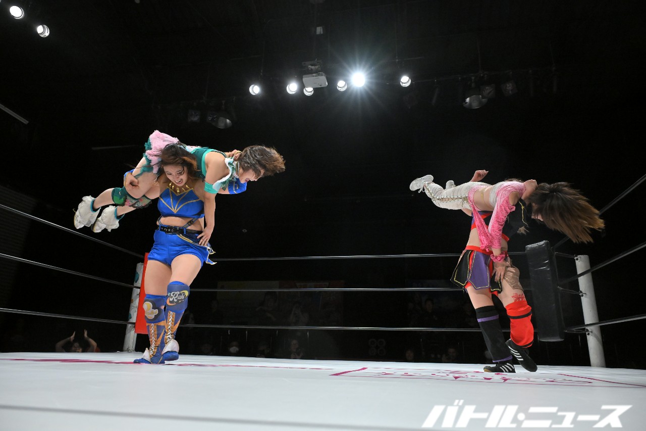 さくらが梨央を捕らえ、絵梨沙がはるかの髪を掴んで引き起こすと、それぞれガットショットからロープに飛ぶが、梨央とはるかは担ぐと、梨央がアティテュード・アジャストメント、はるかがブロックバスターホールドで叩きつけて3カウント。