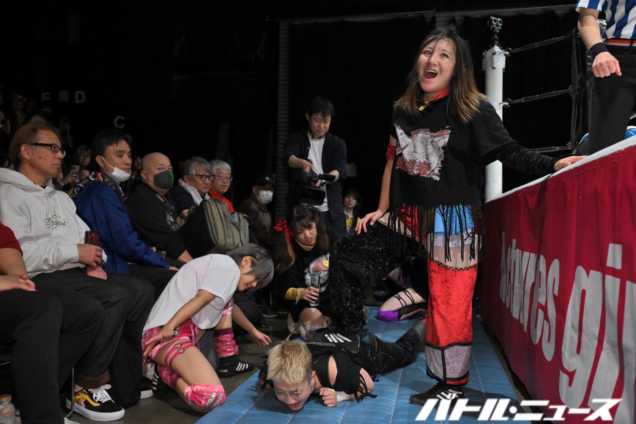 杏加がラダーを奪ってMARUに叩きこみ、コーナーに振って串刺し攻撃からフェイスバスター。さらに顔面に低空ドロップキックからフォールも2。