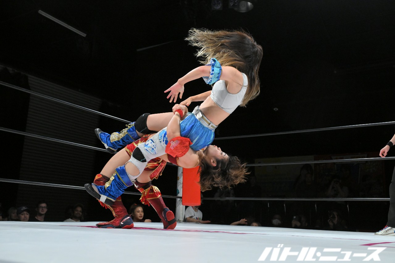 なぎさは再度オフ・ザ・リップの体勢も、切り返した茉莉乃は首投げからロープに飛んでヒーローキック。フォールも2。