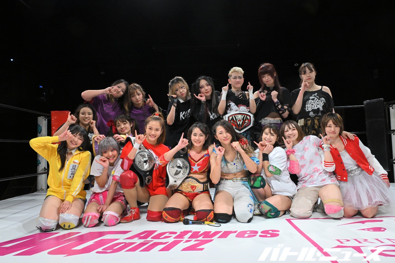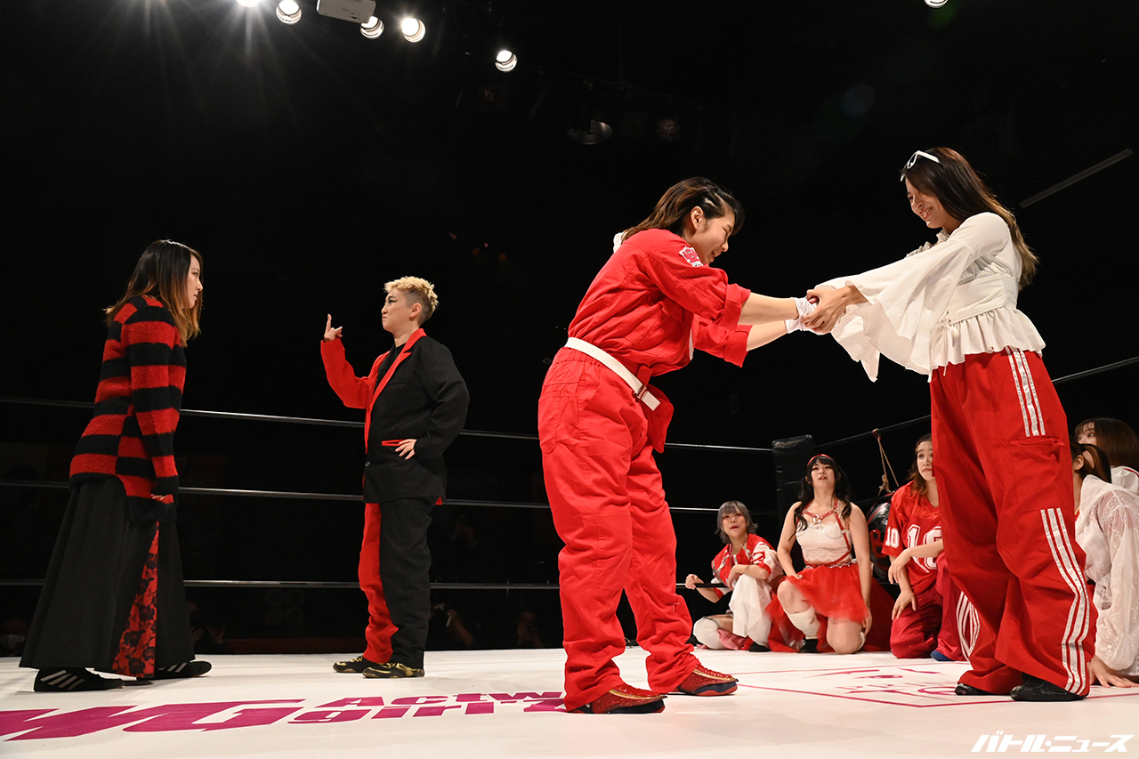 赤と白を基調とした衣装のベビーズと、黒と赤を基調としたキラーズがそれぞれダンスを披露し、全員でリングに上がると『Love Riddle』へ。間奏中にはKING王座戦のMARUと杏加、AEWシングル王座戦の茉莉乃となぎさが対峙し、茉莉乃となぎさは握手するが、中指を立てたMARUを杏加は突き飛ばした。