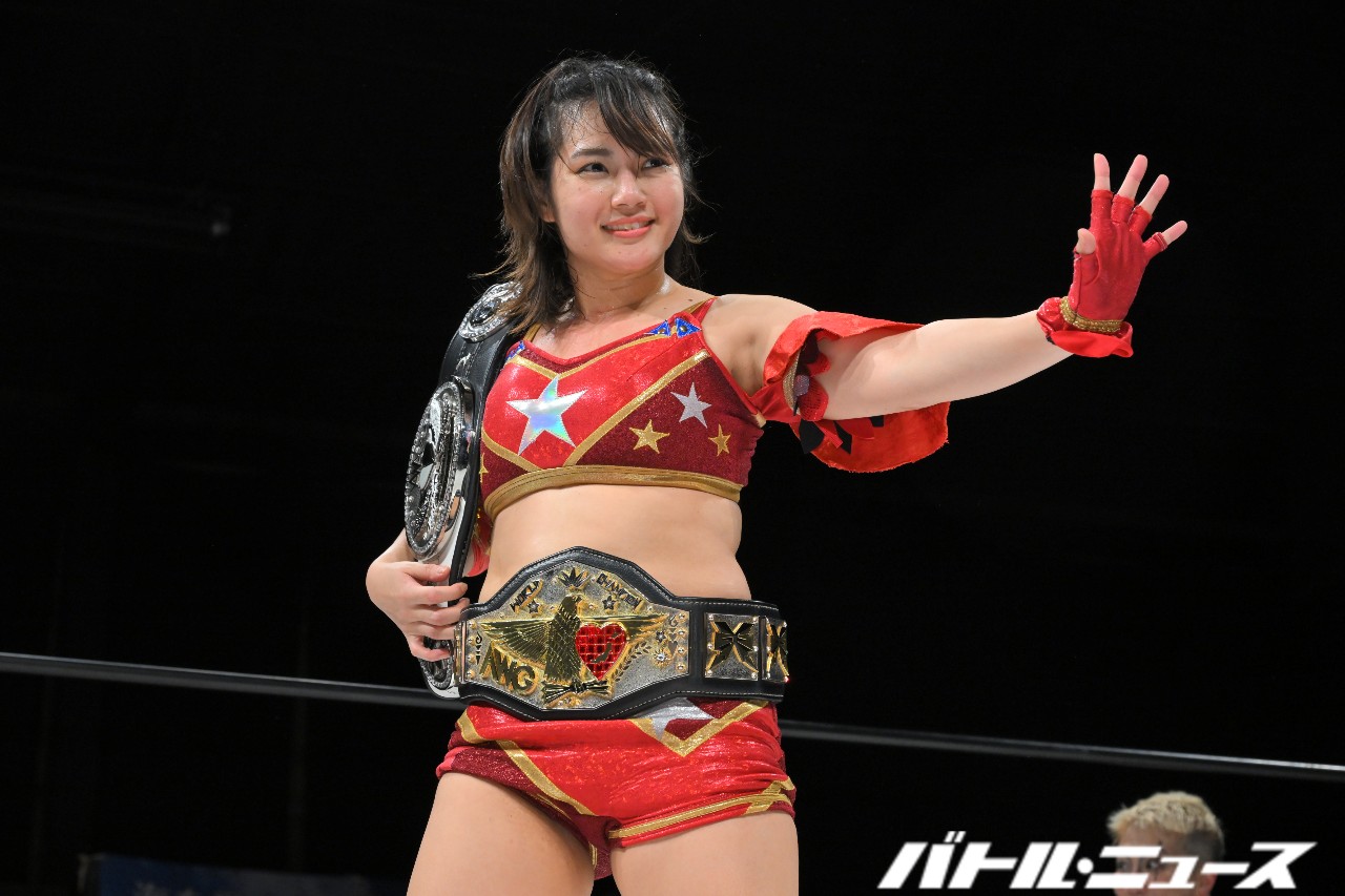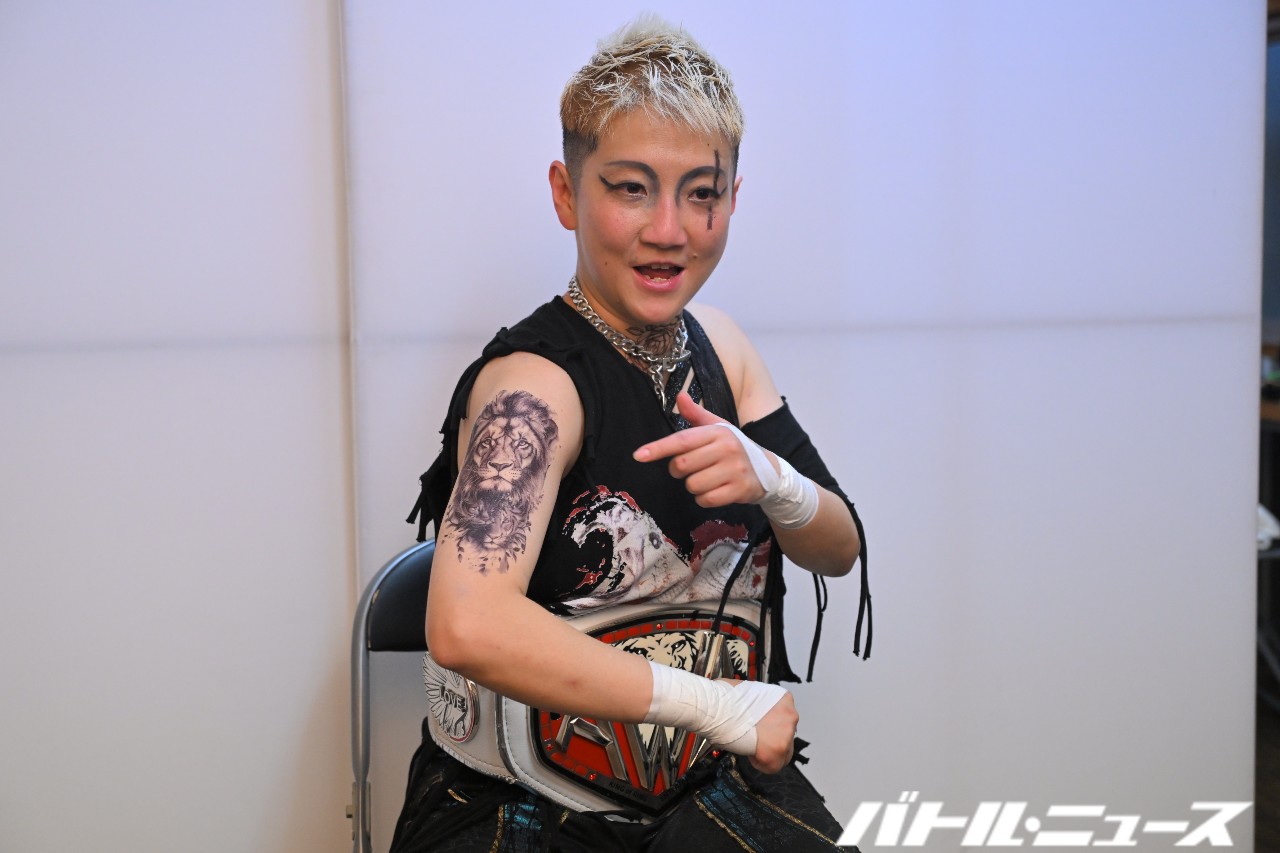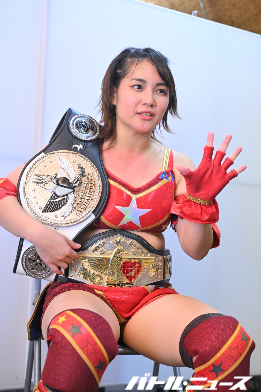 「まあそうですね。唯一、真夏の汐風も言ってはいるんですけど、なんかこう、正規タッグというか、各々タッグを組んでこのベルトの挑戦をしていた人たちじゃない人たちが組んでやるという、タッグ挑戦、タッグベルトの挑戦表明はすごい嬉しいわ嬉しいですやっぱ。そのどういう理由であれ、お前らが持ってる資格ないって言われようが、これを持っていてそれに挑戦したいって思っていただけるように私も頑張らなきゃいけないんですけども、挑戦したいって言っていただけたのはとても嬉しいなと思ってます。そしてMARUさんと彩乃さんが組んで、そんな風に闘っていただけるんだというところもちょっとあったりもするので。ベテラン組って言ってたので、ベテラン組とこのベルトをかけて防衛戦ができるのは本当にすごい私は楽しみです。何を持ってくるかわからないけど(苦笑)怖いところもあるんですけど、でもベテラン組に闘って、これが防衛できた時、このベルトの価値がさらに上がると思うので、私は、MARUさんと彩乃さんとのタッグとこの防衛戦がやりたいなと思っています。ただ本当にこのベルトに関しましては黒幕がなんか仕組んでやったベルトでもあるので、本当にそのMARUさんと彩乃さんと闘えるかどうかわかんないんですけども、私も闘いたいなって思ってるって感じです。はい」