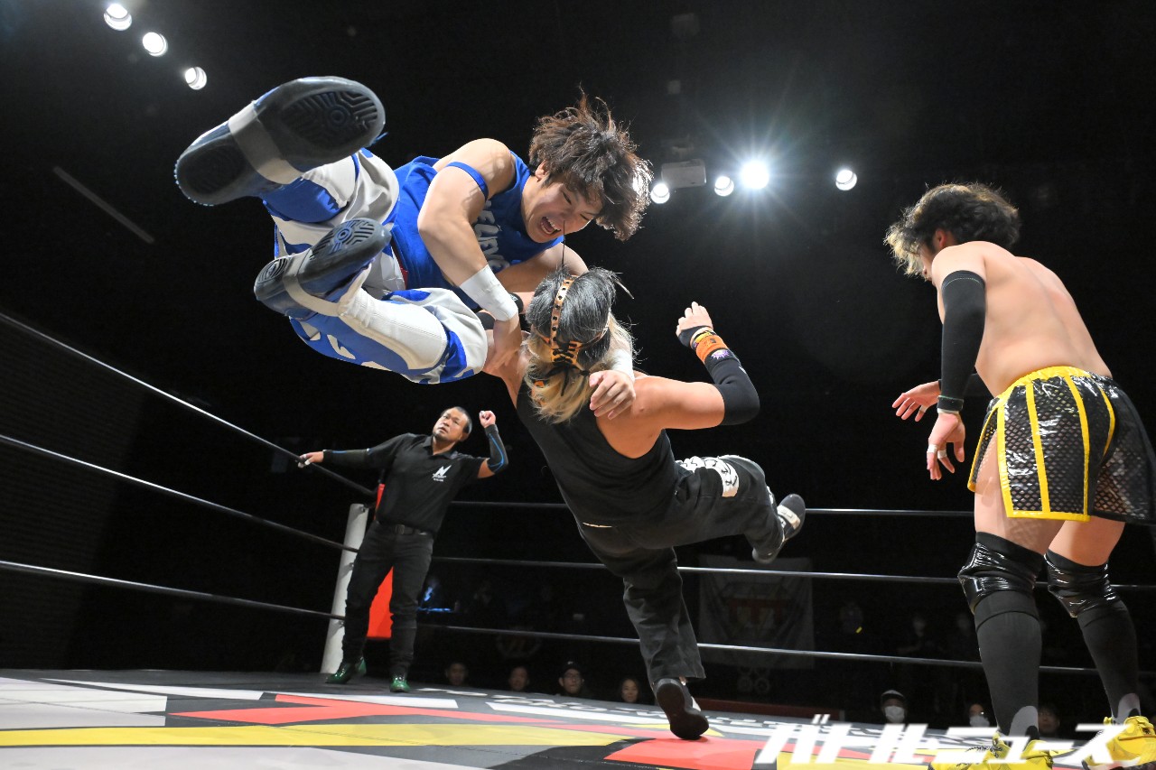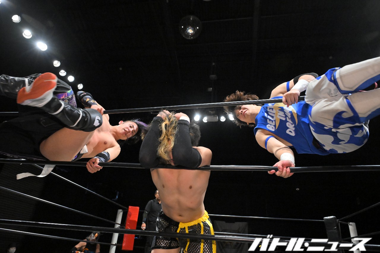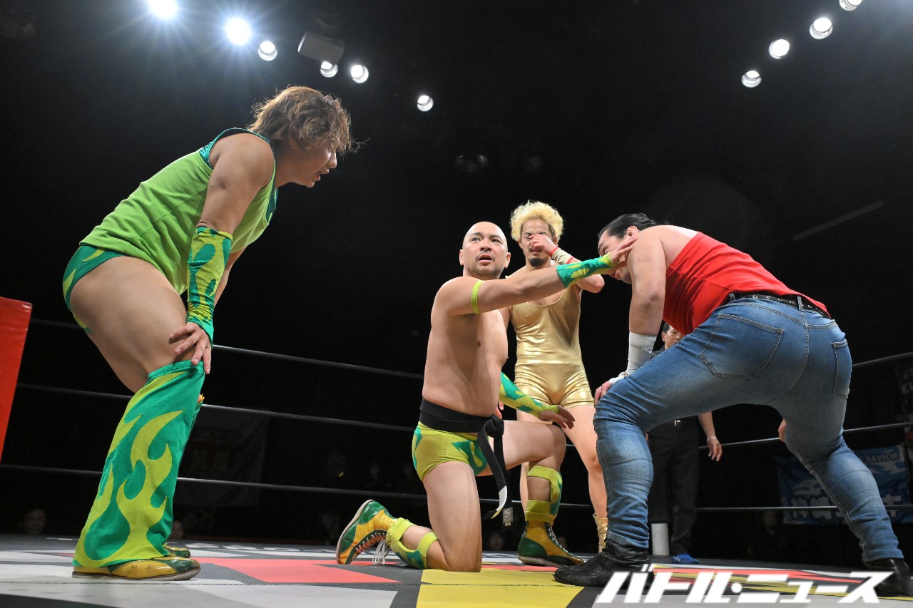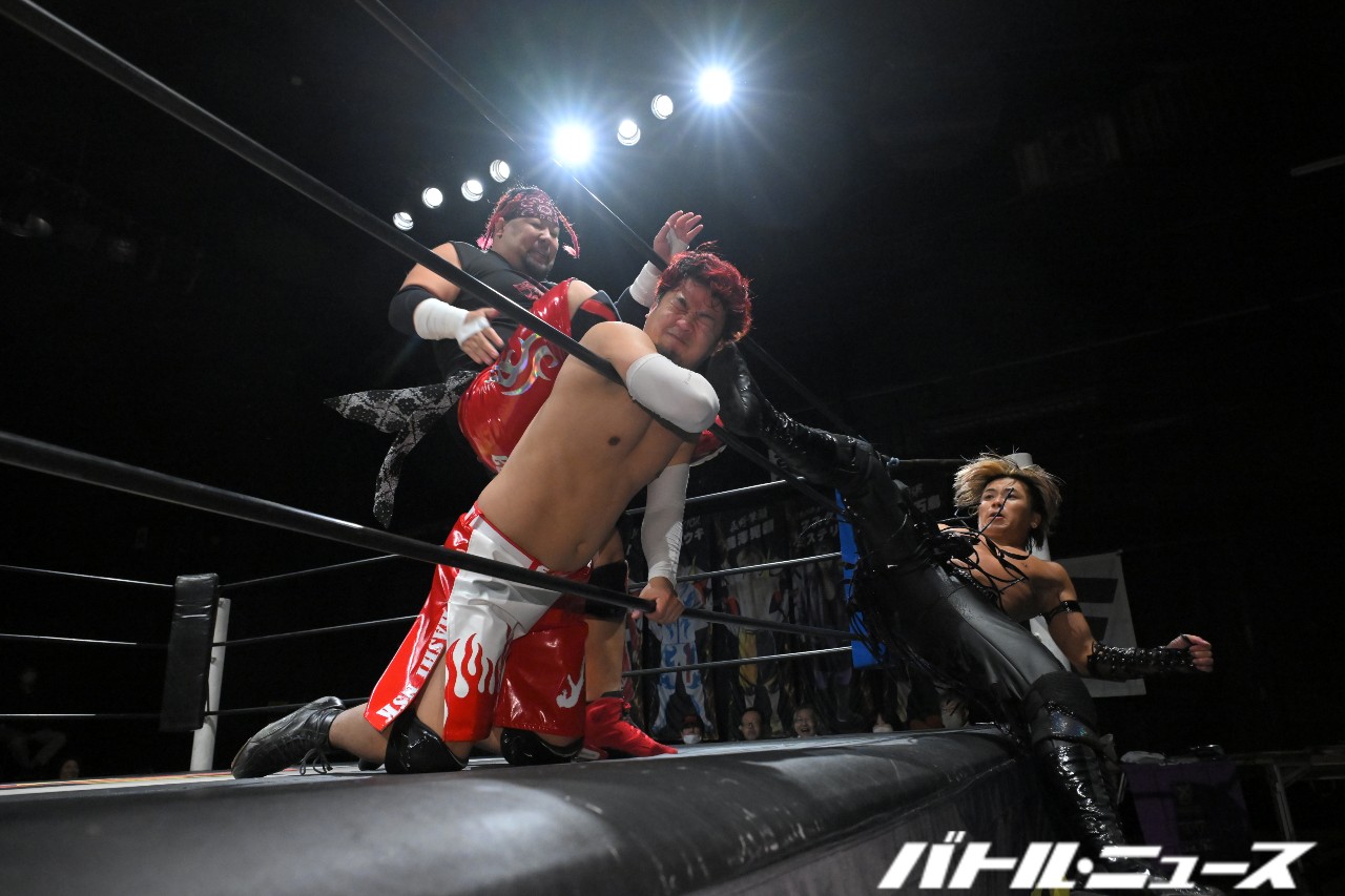 政岡は「来い、来いや」と自身のアゴを指さしてエルボーを打たせるが、政岡がかわして反撃のエルボー。このやり取りが数回繰り返される中、タイミングを見切った橋之介がエルボーバッドをクリーンヒット。ロープに飛ぶも、エプロンから定が捕獲。政岡&定が2人でロープに振ろうとするも、橋之介が攻撃をかわし、定のショルダータックルを政岡に誤爆させる形に。定は「俺があとで怒られんだよ!」とぼやきながらロープに飛ぶが、橋之介がカウンターのドロップキック。ミステリーにタッチ。