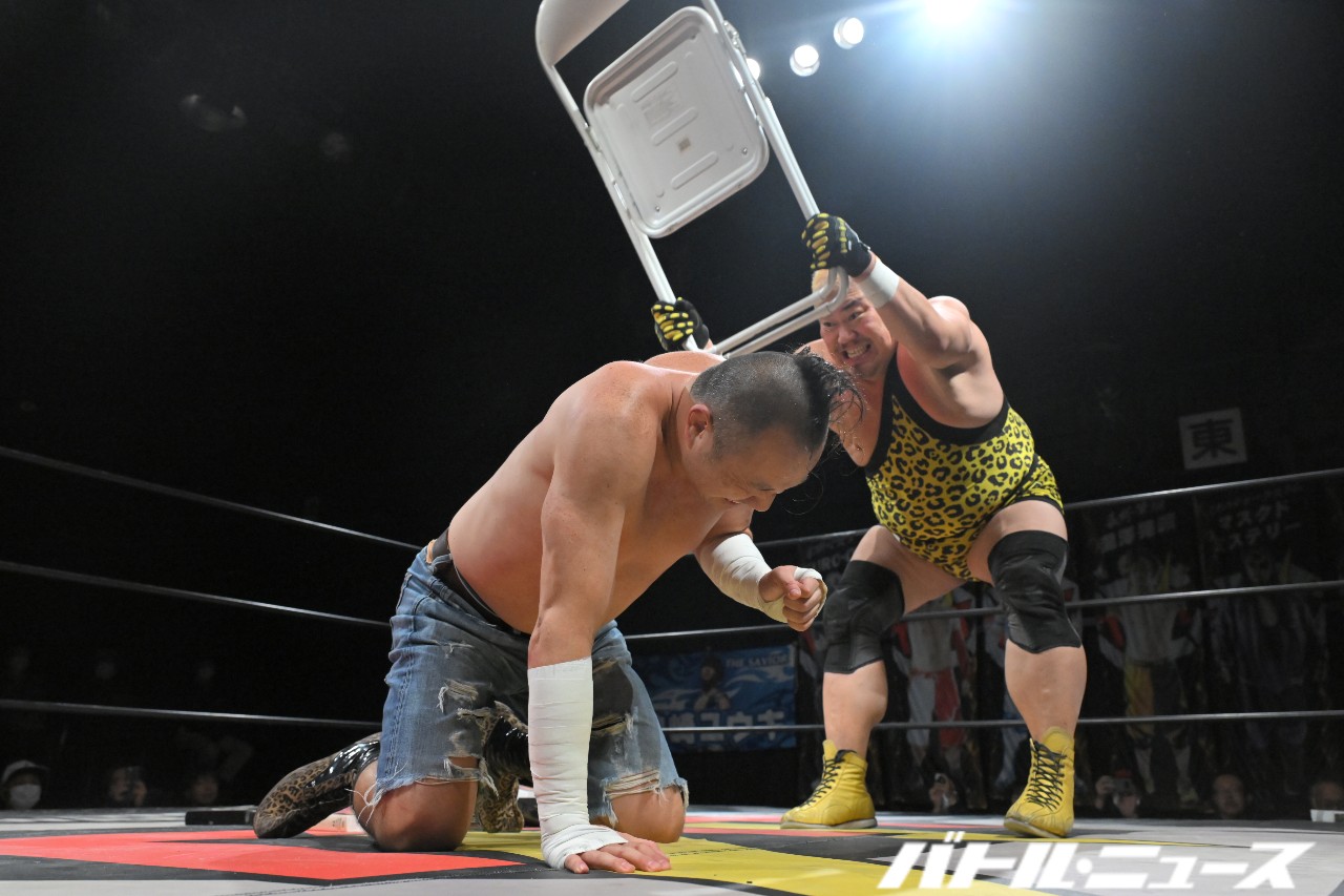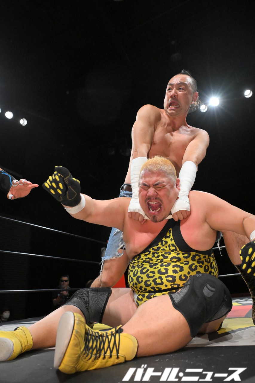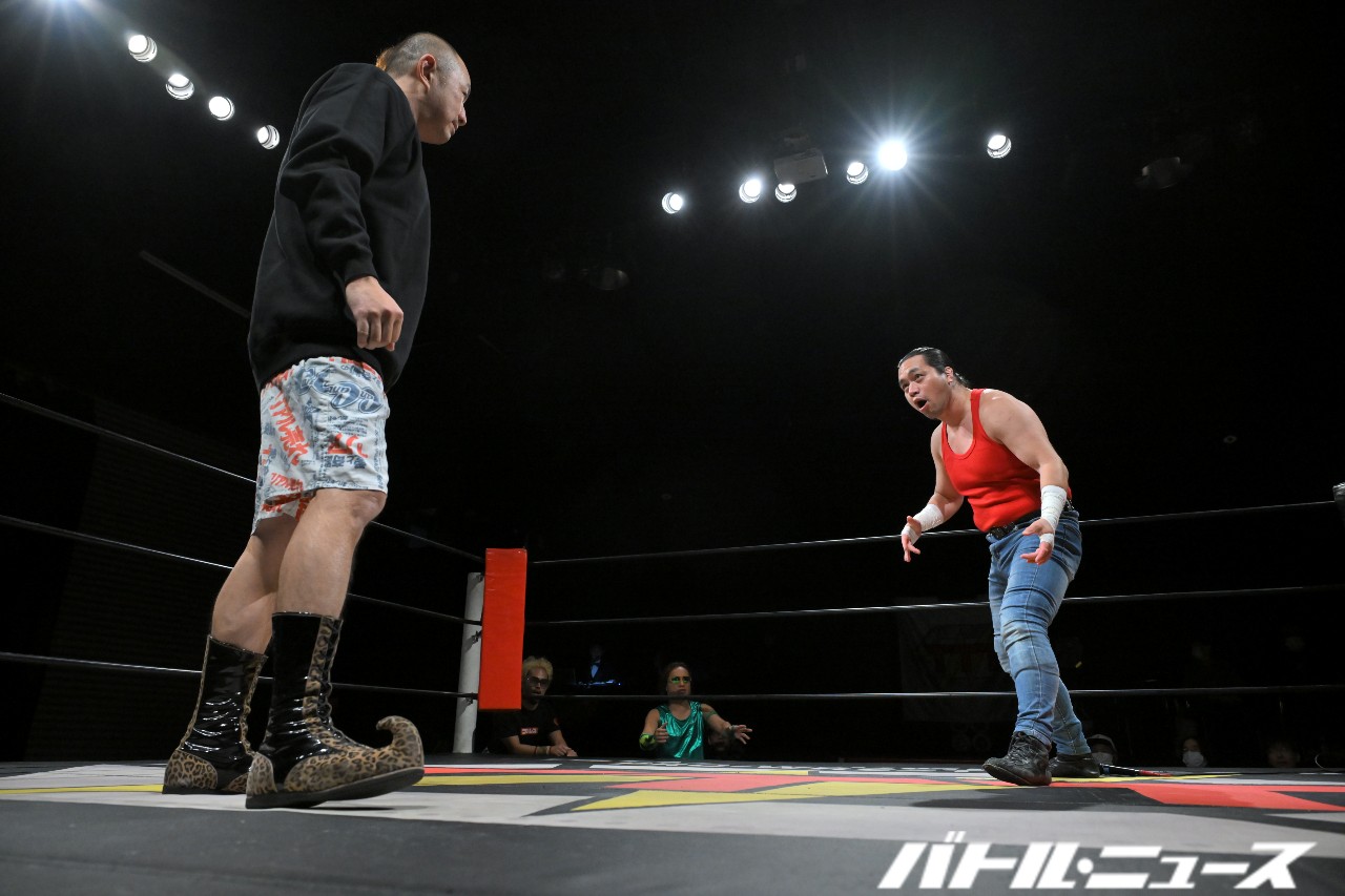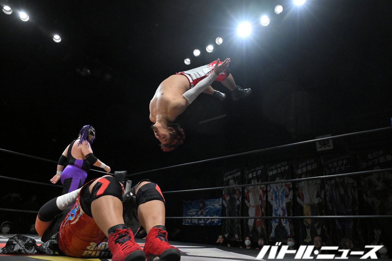 政岡は「来い、来いや」と自身のアゴを指さしてエルボーを打たせるが、政岡がかわして反撃のエルボー。このやり取りが数回繰り返される中、タイミングを見切った橋之介がエルボーバッドをクリーンヒット。ロープに飛ぶも、エプロンから定が捕獲。政岡&定が2人でロープに振ろうとするも、橋之介が攻撃をかわし、定のショルダータックルを政岡に誤爆させる形に。定は「俺があとで怒られんだよ!」とぼやきながらロープに飛ぶが、橋之介がカウンターのドロップキック。ミステリーにタッチ。