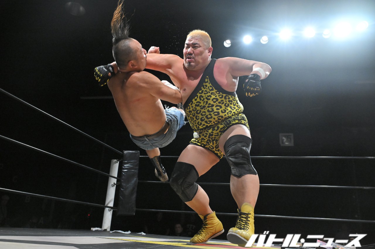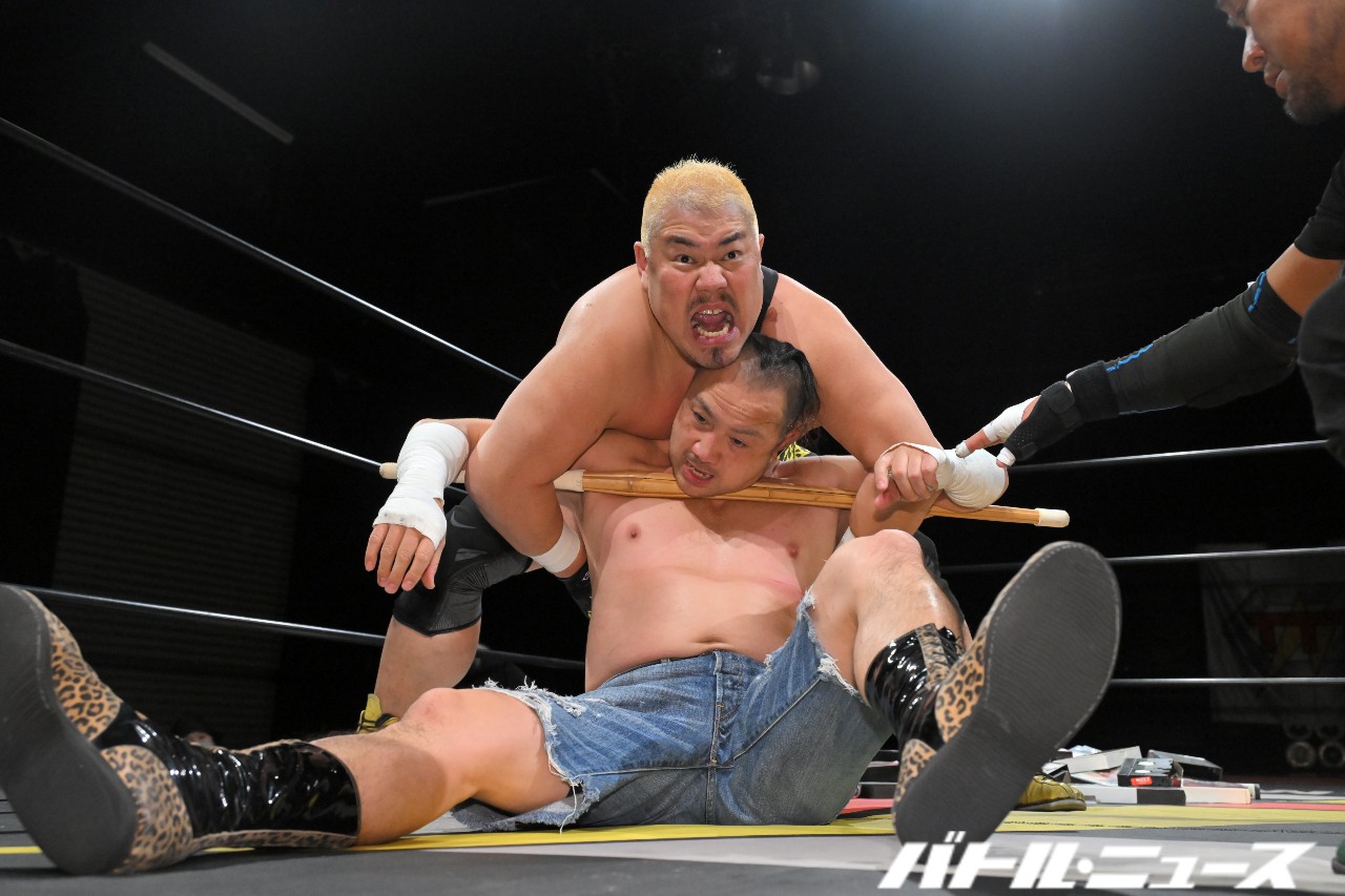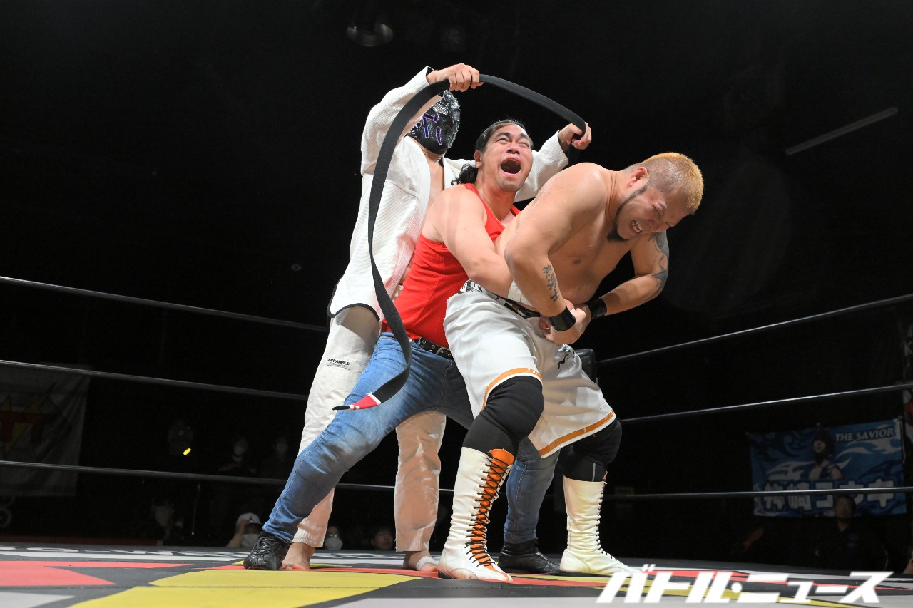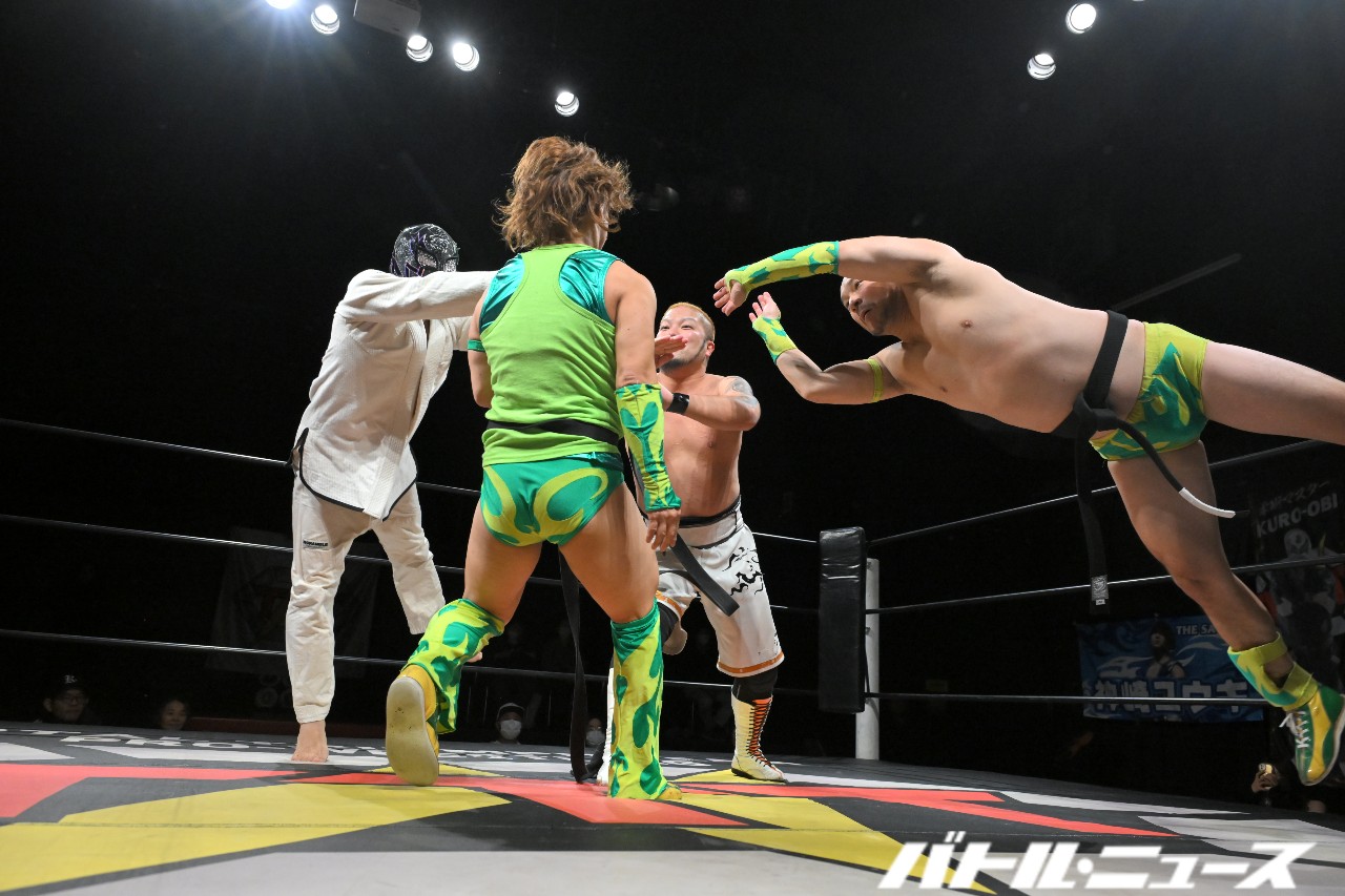 塚本が大家をコーナーに叩きつけ、ボディブローの猛連打から張り手。投げっぱなしヒップトスから串刺しラリアットを狙うが、これをかわした大家がカミカゼを狙う。これを背面着地した塚本がジャーマンを狙うが、KURO-OBIが背後から黒帯で塚本の首を絞め上げて救出。そのまま2人で黒帯を使ったクローズラインを連発。大家、塚本はこの餌食となるが、オースギだけは側転で帯を飛び越えて大家にアームドラッグ、KURO-OBIにドロップキックを見舞う。