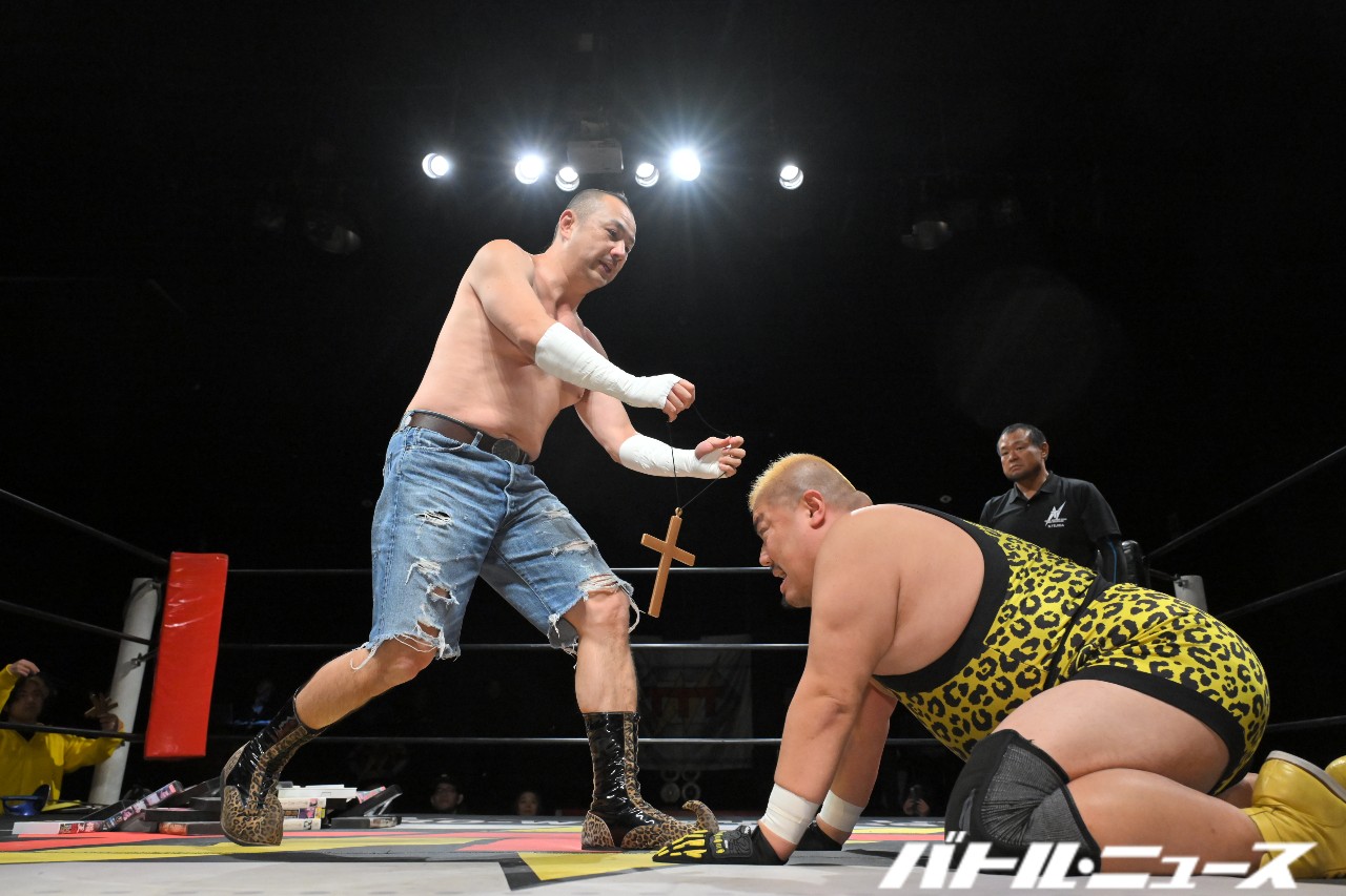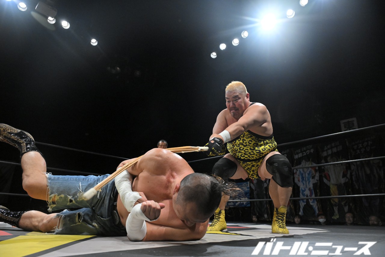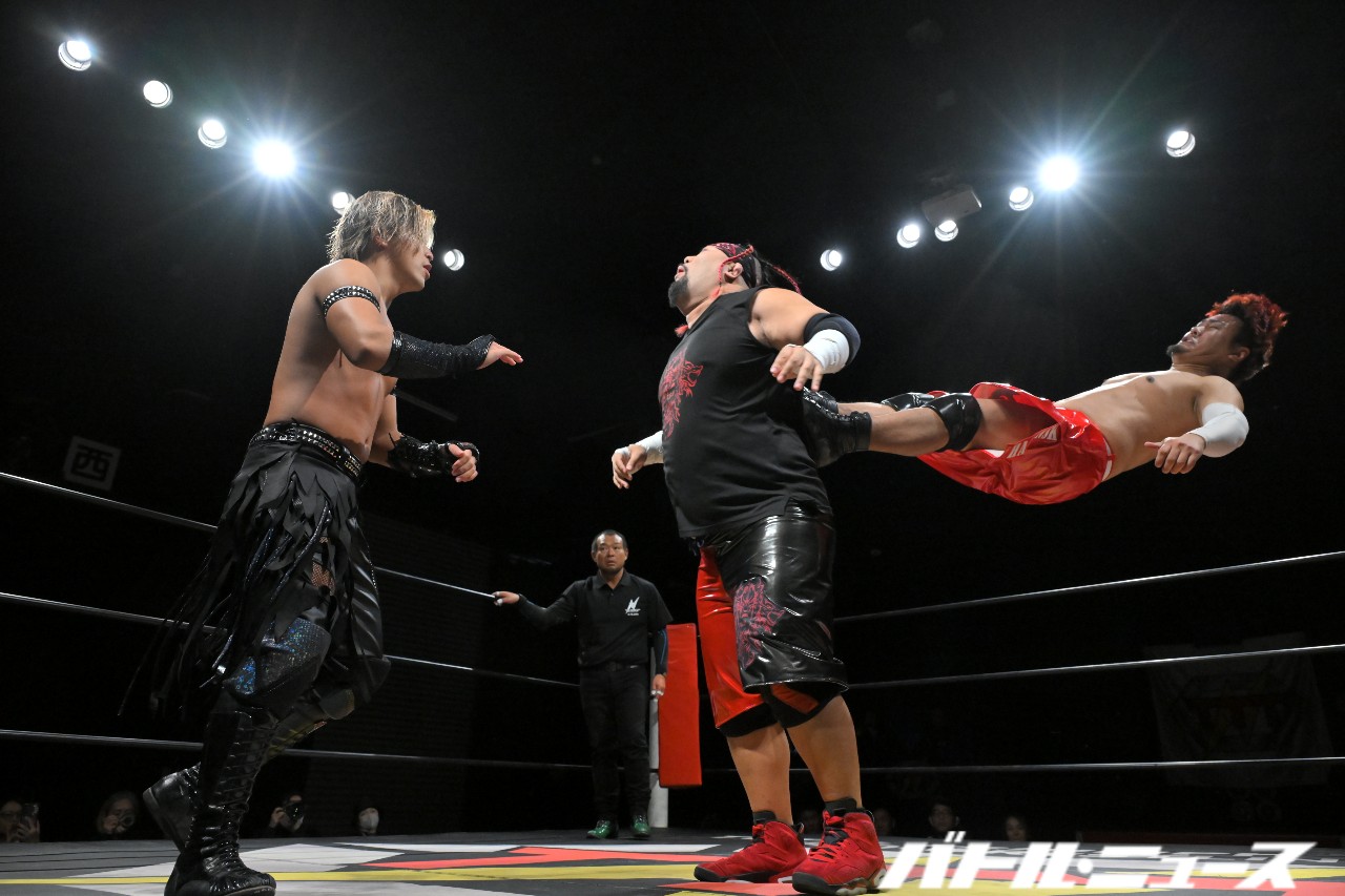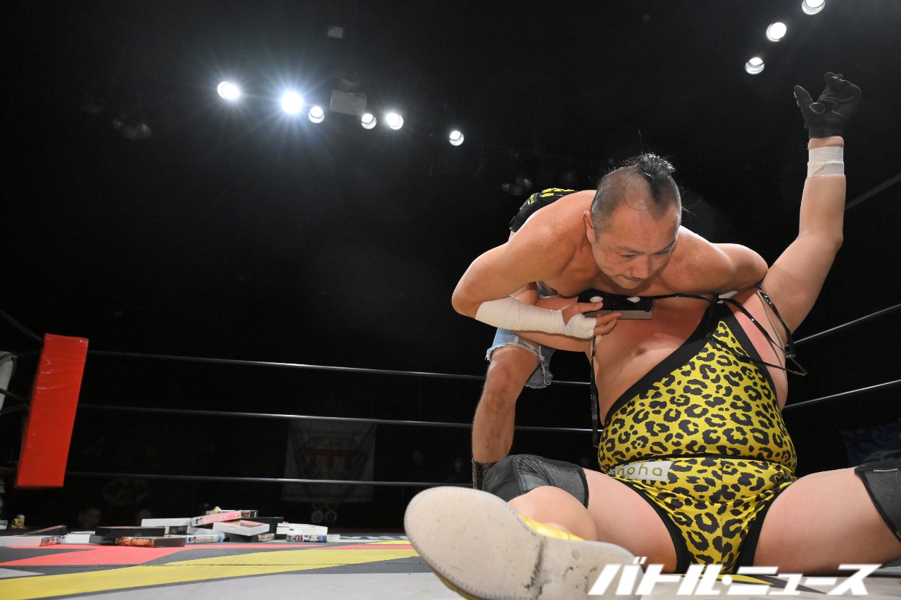 塚本が大家をコーナーに叩きつけ、ボディブローの猛連打から張り手。投げっぱなしヒップトスから串刺しラリアットを狙うが、これをかわした大家がカミカゼを狙う。これを背面着地した塚本がジャーマンを狙うが、KURO-OBIが背後から黒帯で塚本の首を絞め上げて救出。そのまま2人で黒帯を使ったクローズラインを連発。大家、塚本はこの餌食となるが、オースギだけは側転で帯を飛び越えて大家にアームドラッグ、KURO-OBIにドロップキックを見舞う。