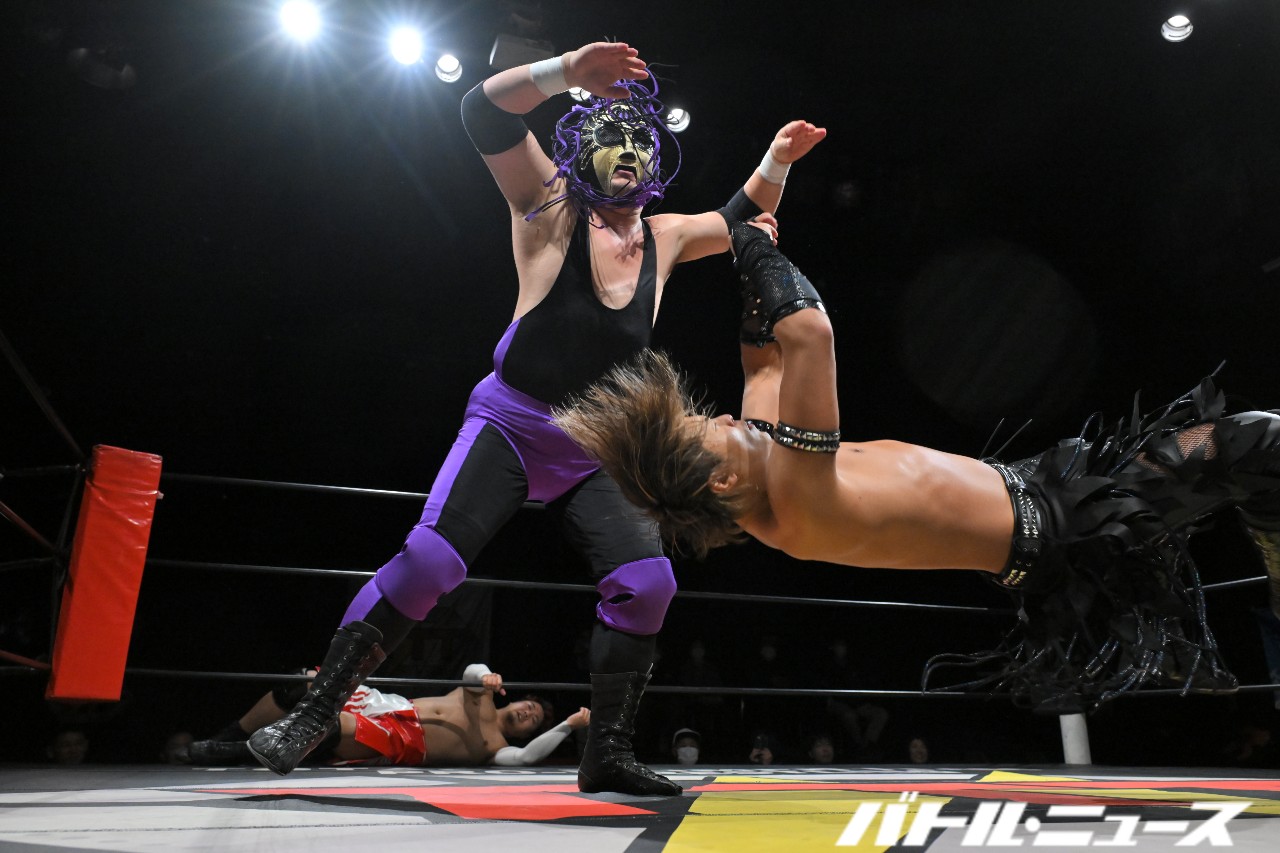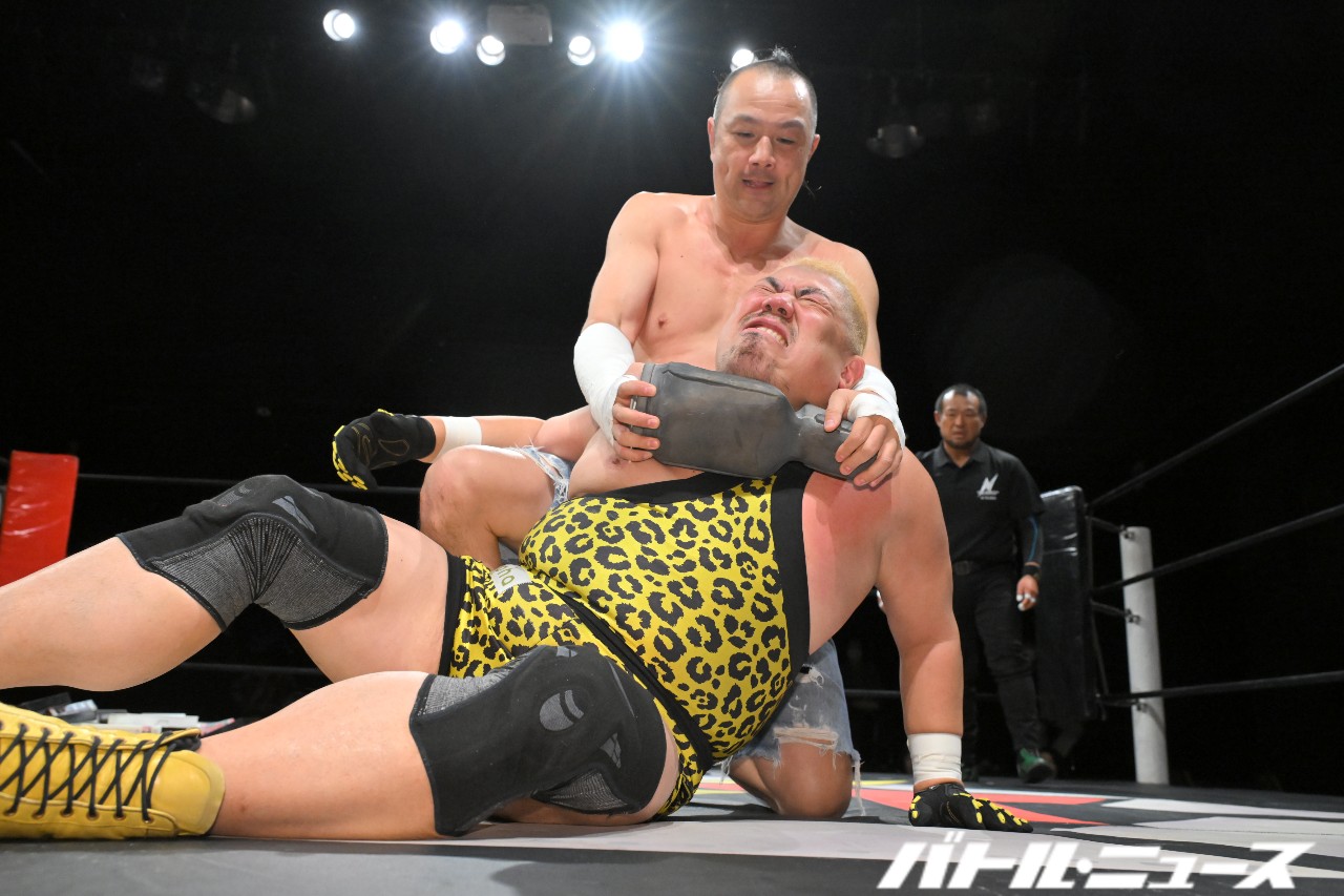 阿部はエルボー連打も、後藤は倒れずボディプレスのように体重をかけながら倒れるボディスラム。さらにボディシザースで絞っていき、阿部は後ろに倒れ込んでカバーするなど必死の抵抗を交えてなんとかロープブレイク。