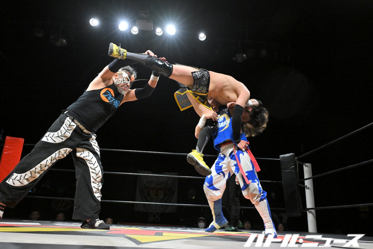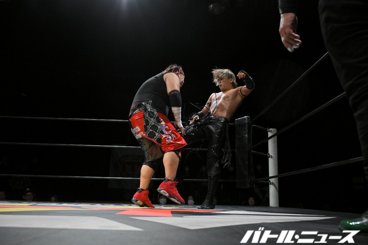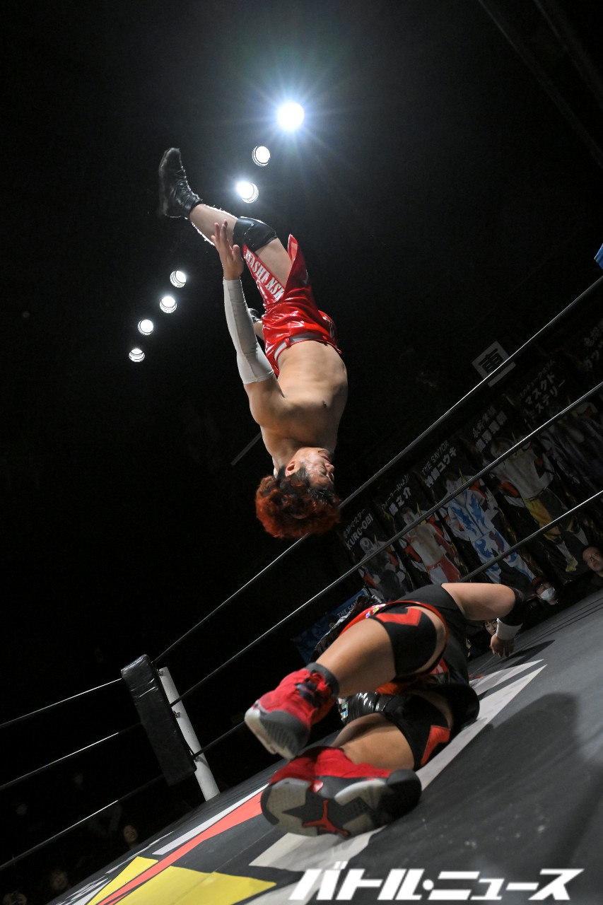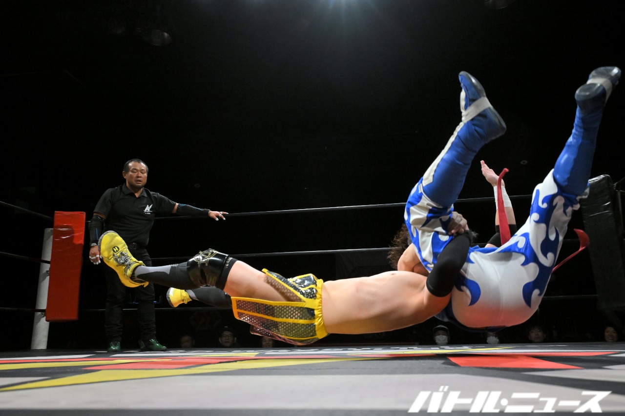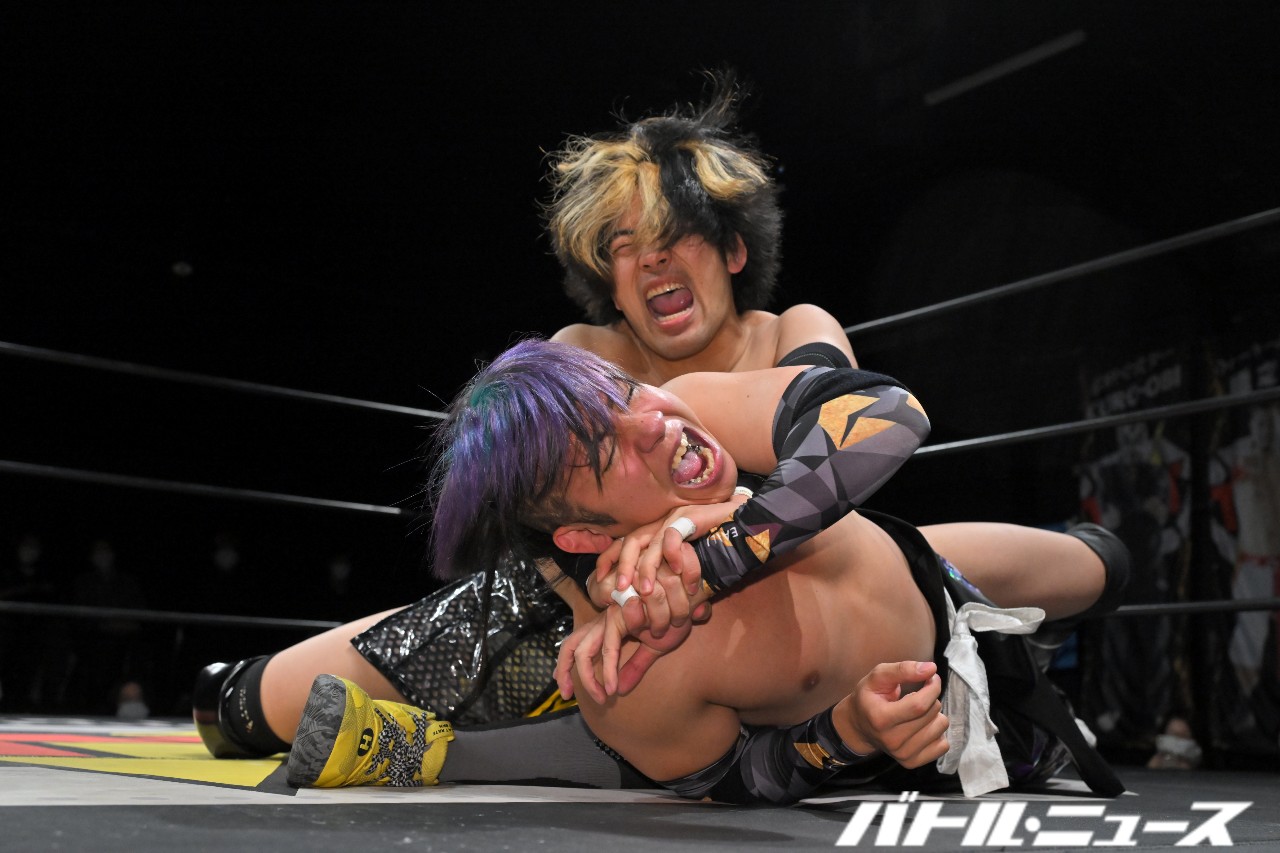 橋之介と政岡の対面。政岡が足払いからロープに飛び、橋之介がリープフロッグでかわしつつドロップキックで先制。橋之介がリストロックも、政岡が固められたまま走り回ることで橋之介を場外に放り出し、場外では定が痛めつけていくという悪の好連携。政岡はミステリーに見せつけながら橋之介に腕固め。さらに指と指の間をロープにこすりつけてから定にタッチ。