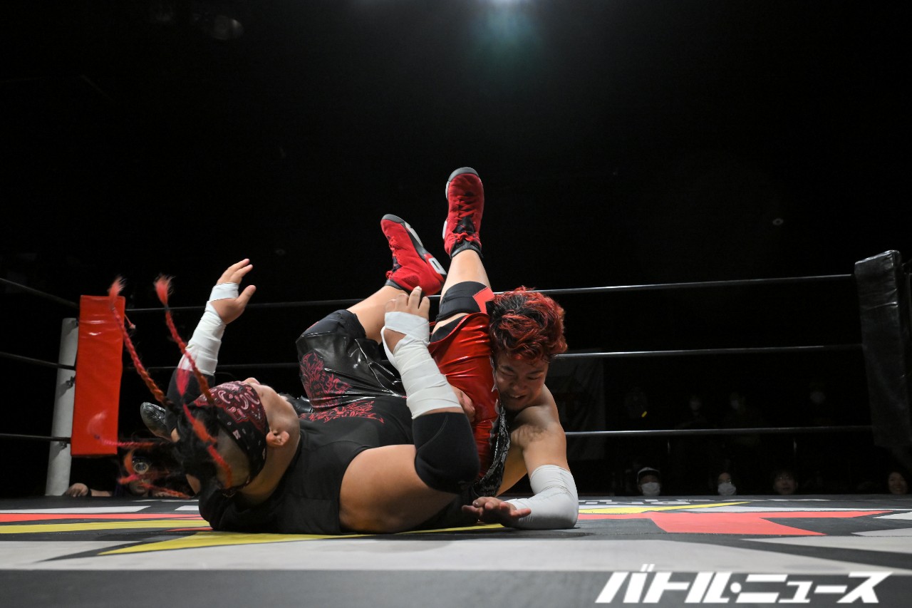 ロックアップからリストの取り合いが展開され、手4つから藤田が足払いからレッグロック。神崎は藤田のゴキブリマスクの触覚を引っ張ることで脱出。両者タッチ。