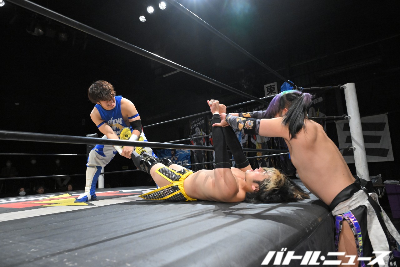 瀧澤は中野をランニングエルボーで倒し、コーナーに控える神崎にもエルボーを放つが、神崎がかわして瀧澤を羽交い締めに。中野が串刺しエルボーを放つが、瀧澤が回避したため神崎に誤爆。瀧澤はスクールボーイで転がしてからの低空ドロップキック。さらに足払いで倒してクロスレッグ式の変形ジャックナイフ。