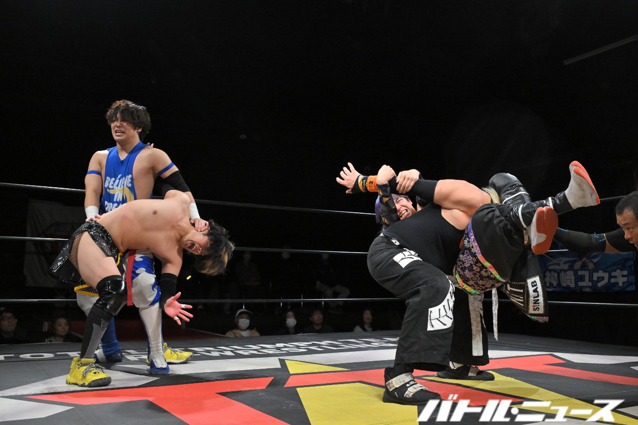 神崎&中野のダブル619が決まり、神崎がハーフハッチ・スープレックス・ホールド。再びフィッシャーマンを狙うが、持ち上げるたびに藤田が瀧澤の足を掴んで下ろすという不可思議なアシスト。キレた瀧澤が藤田を排除にしようとするが、藤田がカウンターのエルボー。瀧澤も神崎にバイシクル・キック。中野が再びスワンダイブ式ミサイルキックを狙うが、瀧澤が回避。着地したところを藤田が場外へと放り出す。