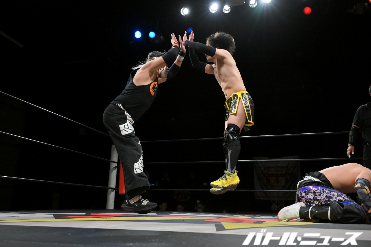 これをミステリーがカットし、定&政岡にダブルチョークスラムを狙う構え。しかし、2人は同時に着地してサミングからダブルのヒザへの低空トラースキック+顔面へのダブルトラースキックを決めるという見事な連携でミステリーを排除。