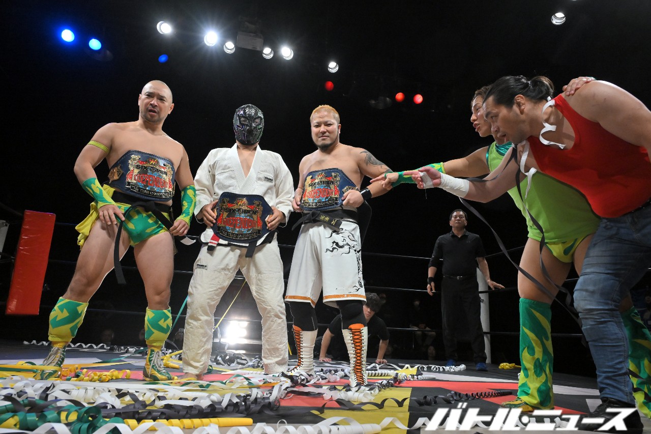 全員で場外になだれ込んでいって乱闘が行われるも、黒帯軍団は自身の帯で対戦相手をリング鉄柱や階段といった場所に縛り付けてリングアウト勝ちを狙う。カウントアウト決着は王座が移動しないルールのベルトということで、挑戦者だった前回と違って今回は有効な作戦。しかし、挑戦者組もなんとか振りほどいてリングに戻ってくる。
