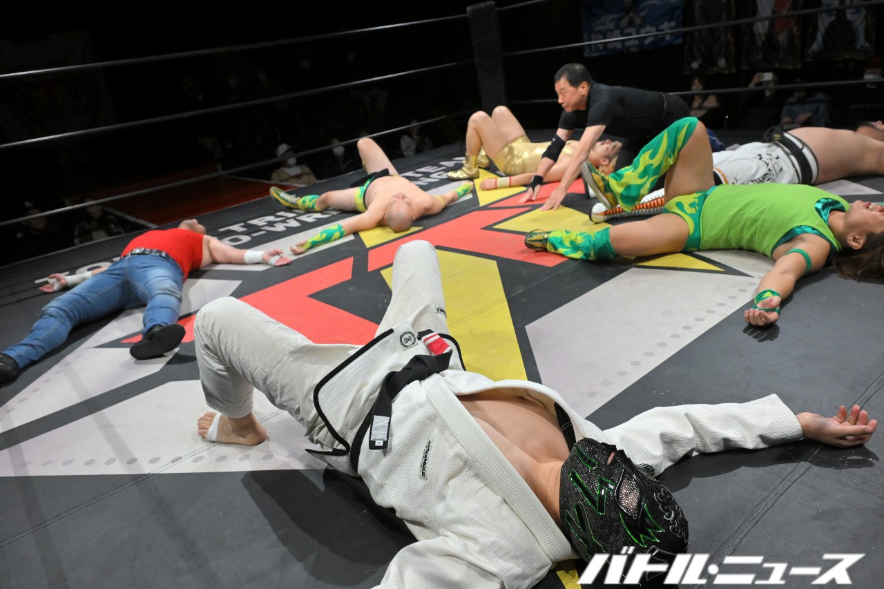千賀の物騒な掛け声からゴングが鳴り、黒帯軍団は全員グラウンドをゴロゴロと寝ながら相手の足を狙っていくジュージュツスタイル。ならばと挑戦者側もジュージュツスタイルとなり、リング上をゴロゴロ。6人のおじさんたちがひたすらにリング上をゴロゴロするだけの光景が広がり、おじさんなのでスタミナが切れて全員天を仰いで倒れ込む。レフェリーのカウントが叩かれ始めると慌てて全員2で返す。