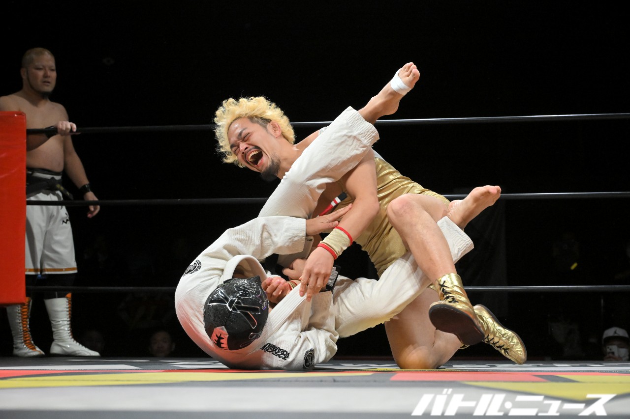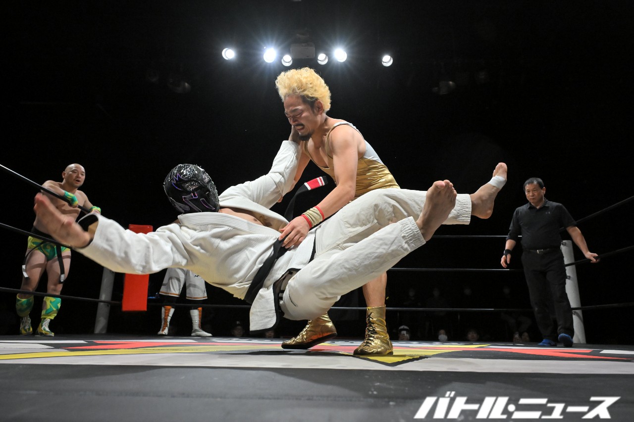 リング上でKURO-OBIとヒロシが対面すると、唐突にプロレスリング柔道の試合のように柔道対決が始まる。KURO-OBIがリストロックから下に引き込んで三角絞めのフェイントから腕十字に入る熟練のテクを見せると、ヒロシも一本背負って反撃。そのままレッグロックに入るも、大家&オースギがカット。