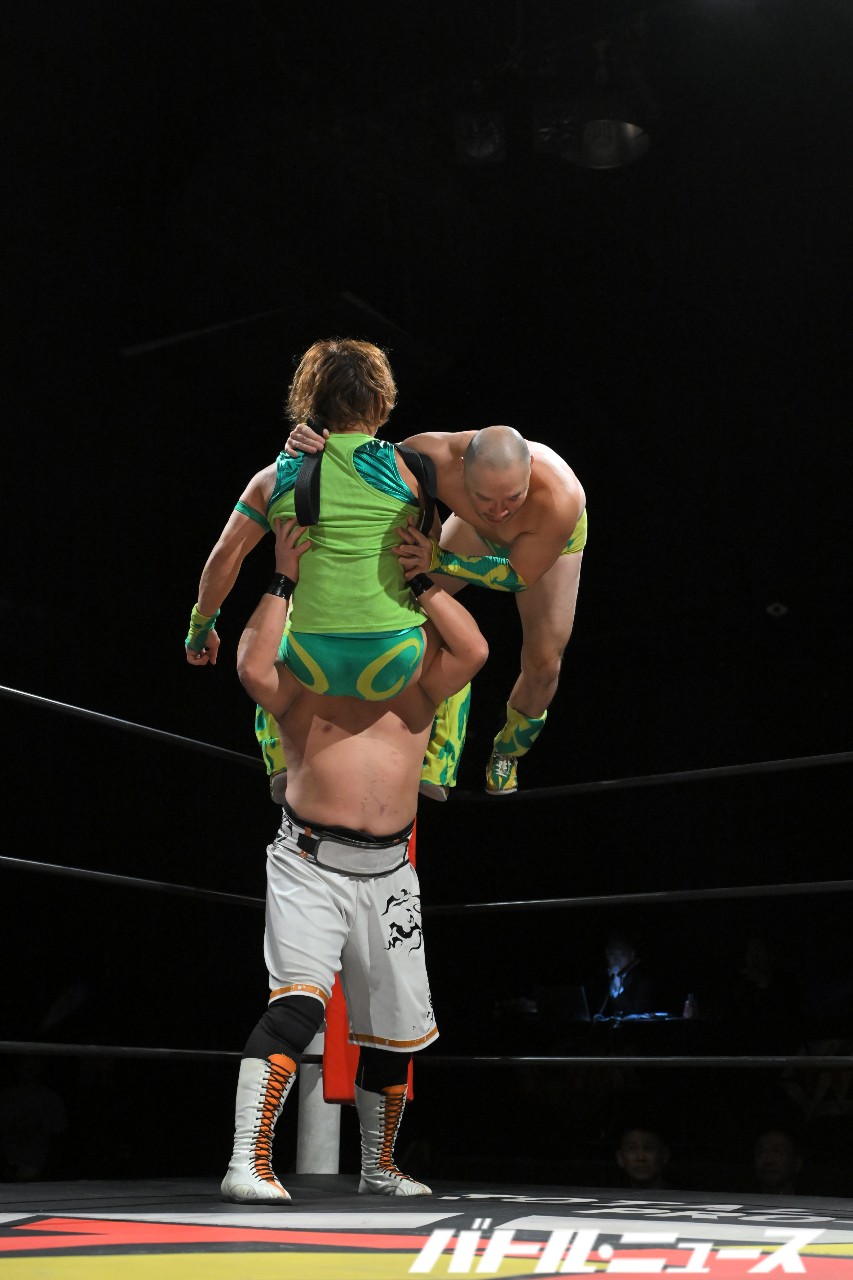 橋之介がコーナーに上ってスワントーン・ボムを発射も、定がこれを回避しMADE IN NERIMA。さらに担ぎ上げるも、背面着地した橋之介が後頭部にエルボー。ロープに飛ぶが、定がこけさせてロープに倒し、定の串刺しランニングニー+政岡の場外からのビッグブーツの同時攻撃が炸裂し、カバーに入る。