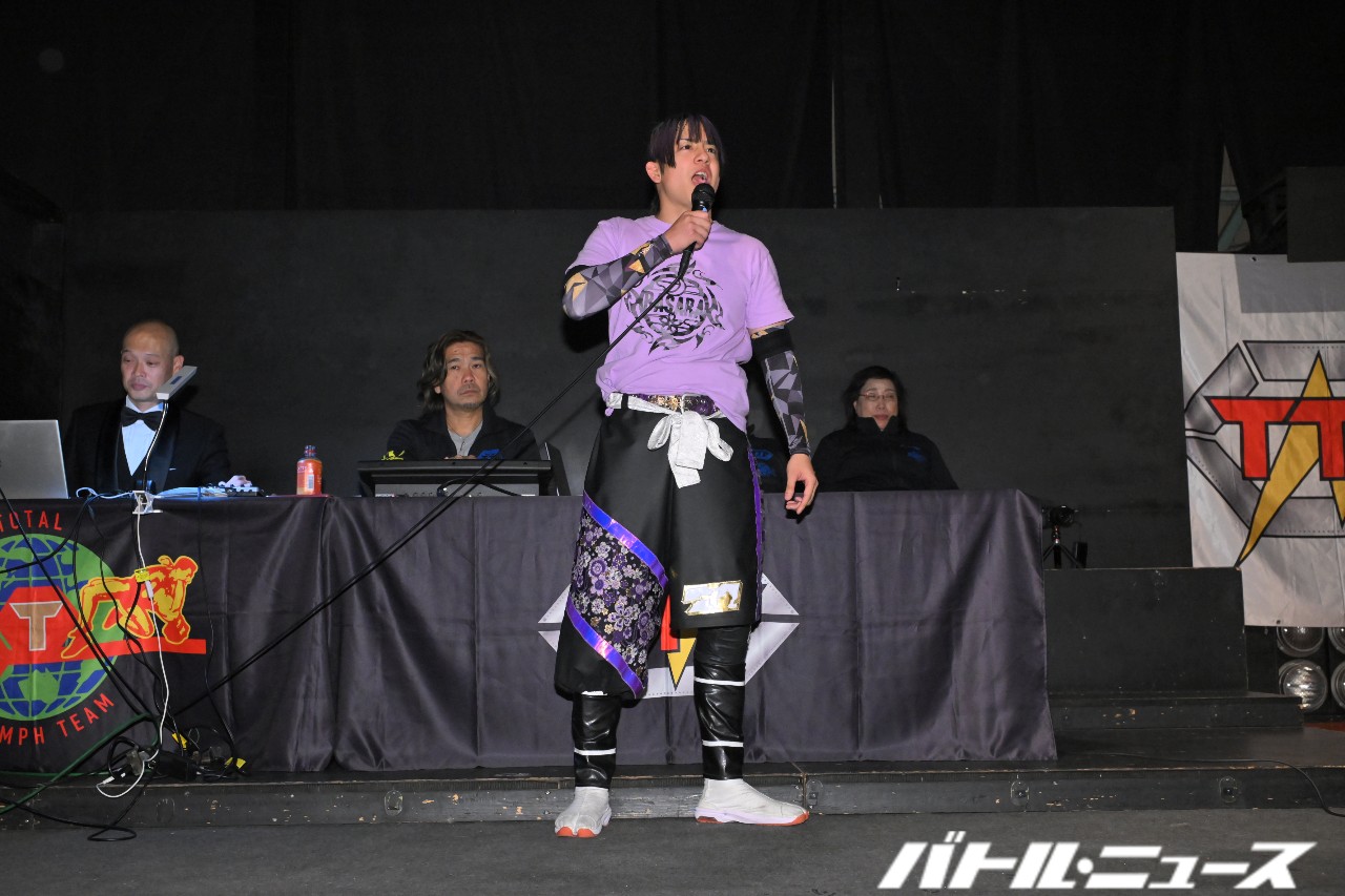 今回は阿部がくじ引きを引くことになったが、「なんか(本部席に)置いてあったから」とインディー統一タッグ王座のベルトを肩にかけながら登場。